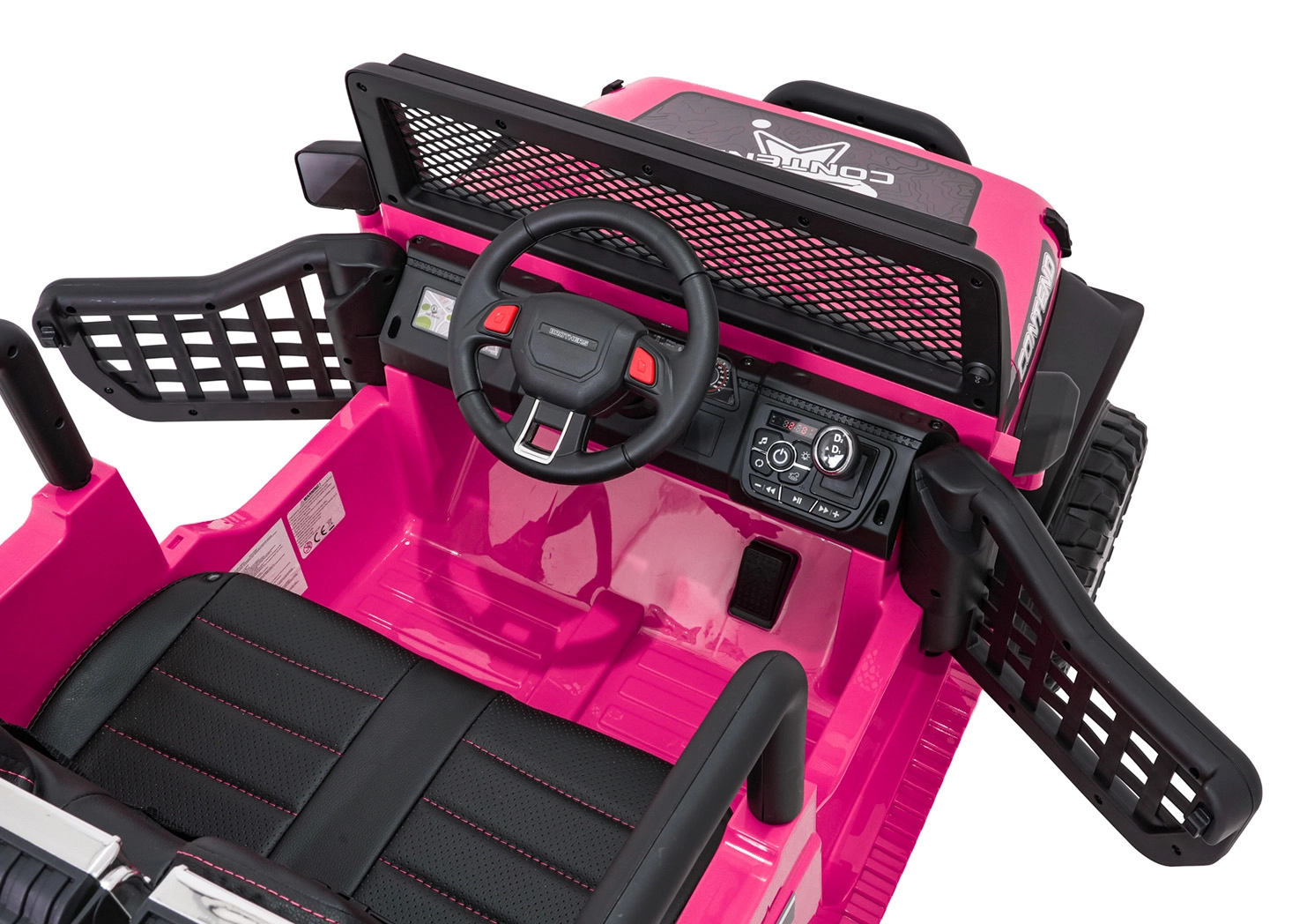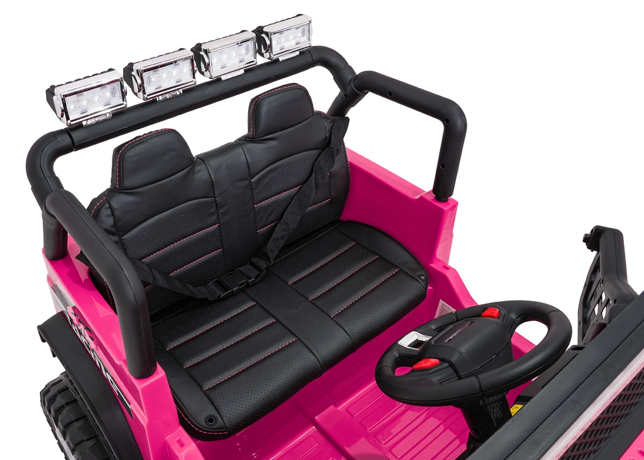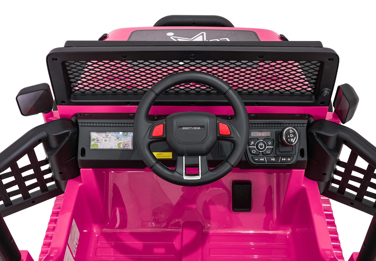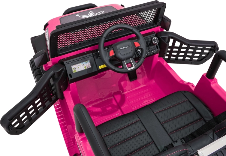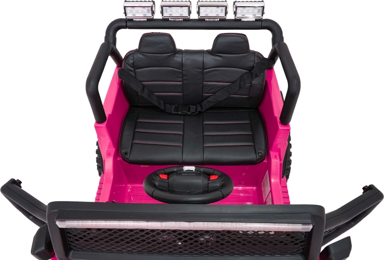 Bezpečnosť zabezpečujú bezpečnostné pásy, plynulý soft start bez cukania a diaľkové ovládanie 2,4 GHz s tromi rýchlosťami a núdzovým tlačidlom STOP. O zábavu sa stará bohatá výbava: FM rádio, MP3, Bluetooth, USB, AUX, zvuky a klaksón na volante aj indikátor nabitia. Otváracie dvere uľahčia nástup a dvojité sedadlo z eko kože ponúkne pohodlie pre dve deti.
