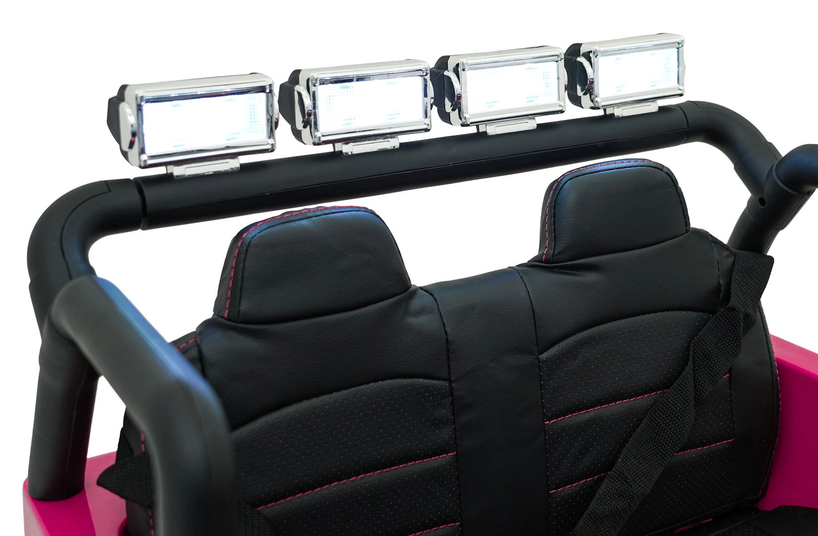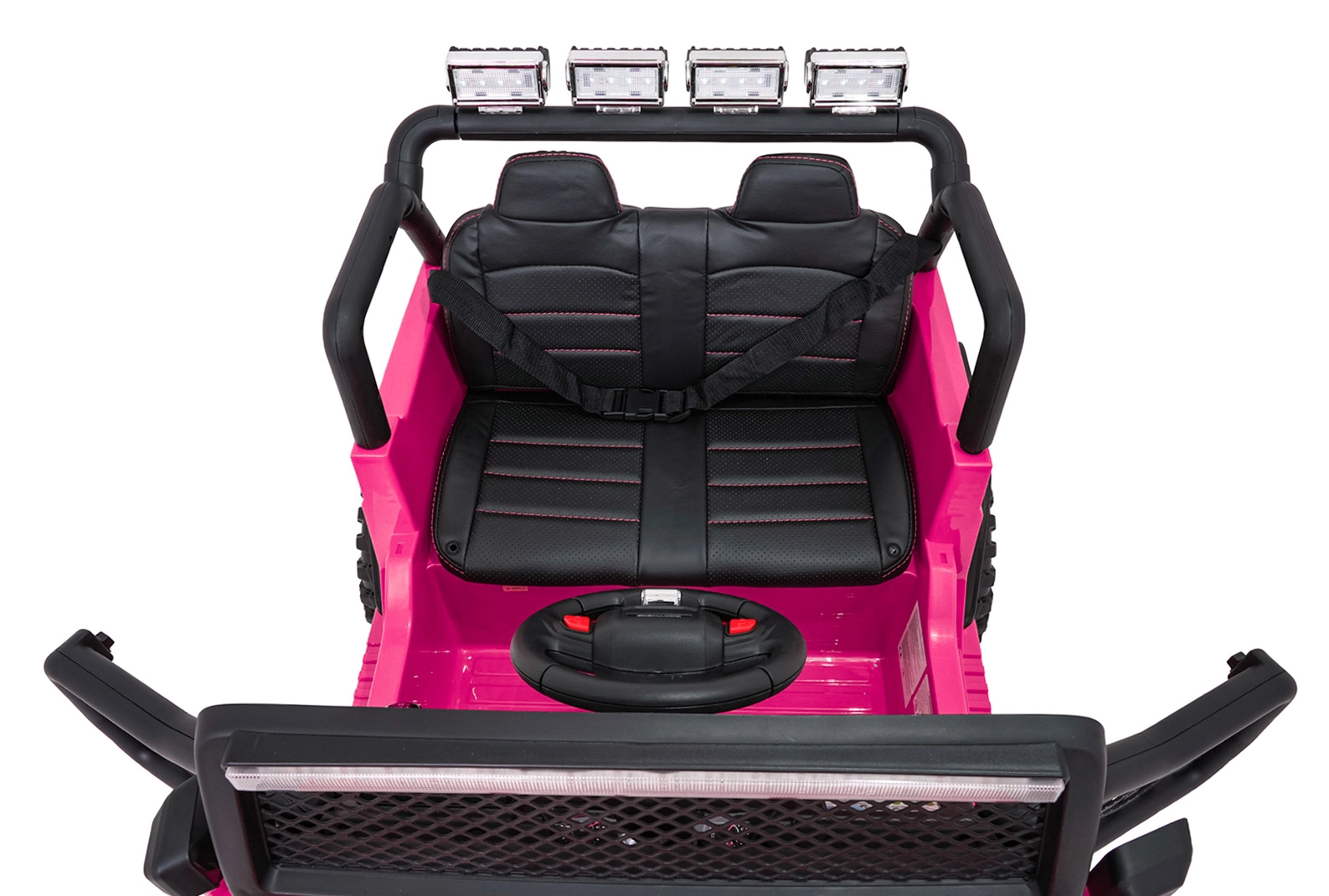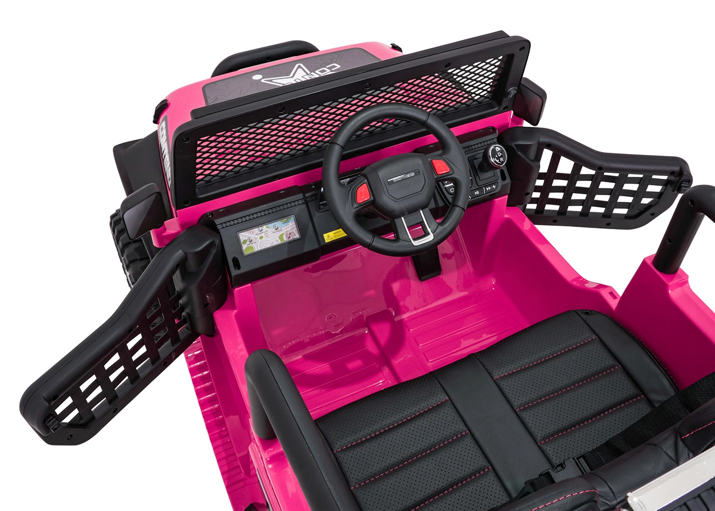 Bezpečnosť zabezpečujú bezpečnostné pásy, plynulý soft start bez cukania a diaľkové ovládanie 2,4 GHz s tromi rýchlosťami a núdzovým tlačidlom STOP. O zábavu sa stará bohatá výbava: FM rádio, MP3, Bluetooth, USB, AUX, zvuky a klaksón na volante aj indikátor nabitia. Otváracie dvere uľahčia nástup a dvojité sedadlo z eko kože ponúkne pohodlie pre dve deti.