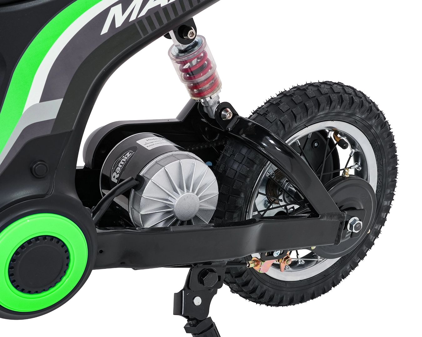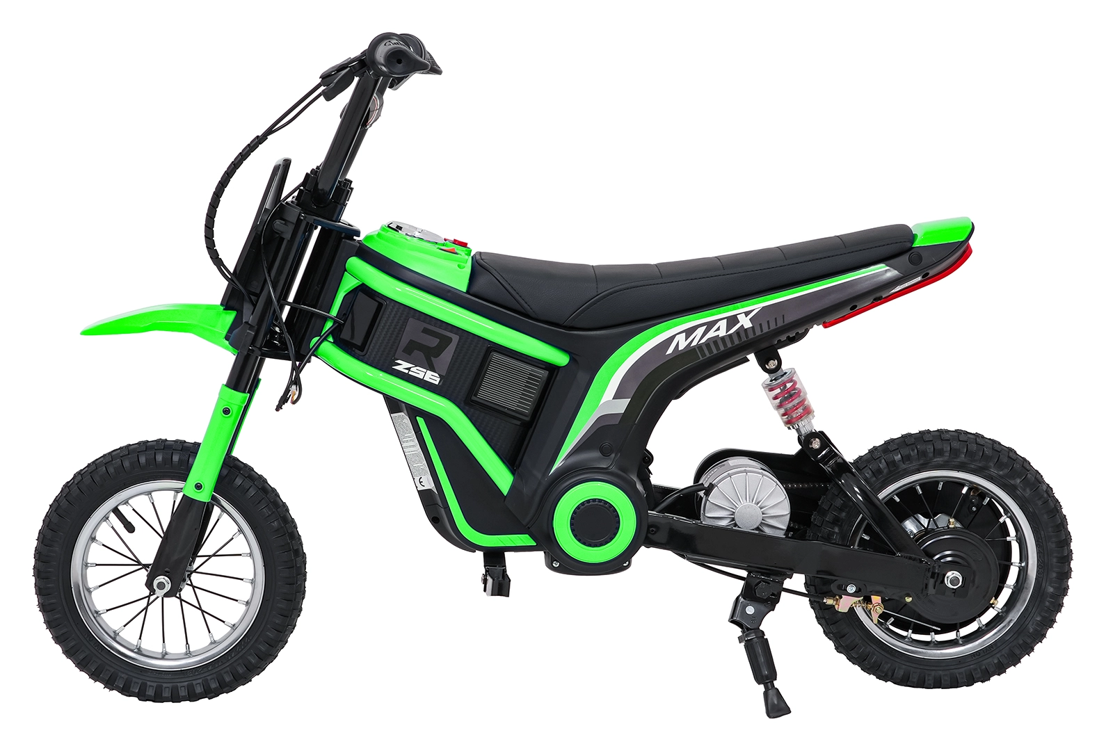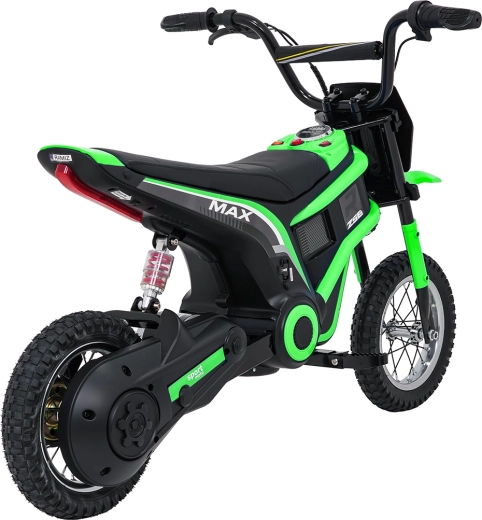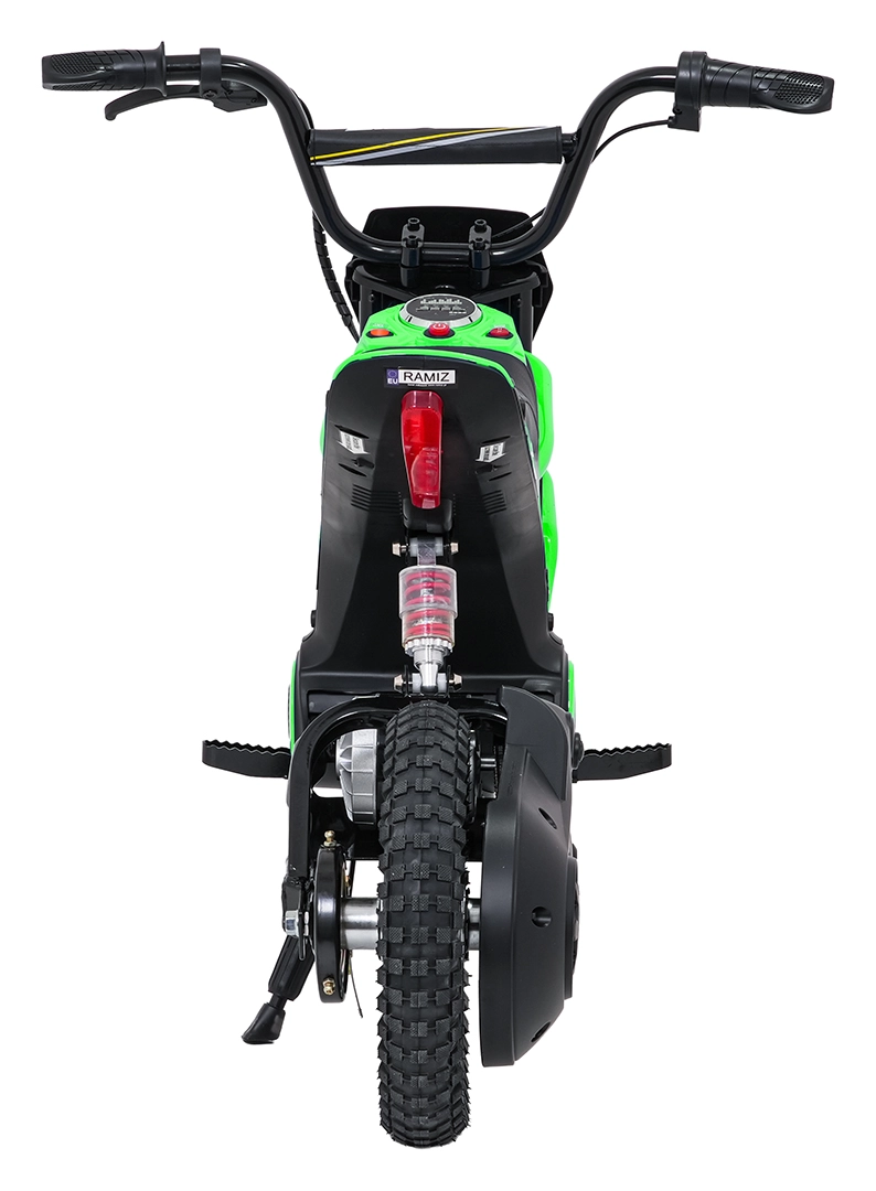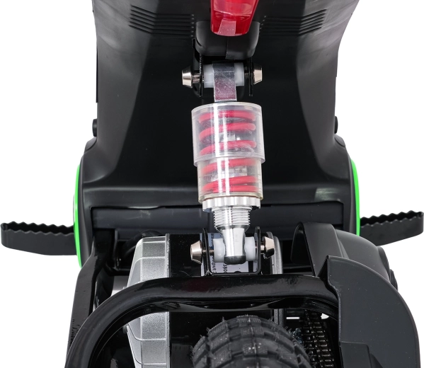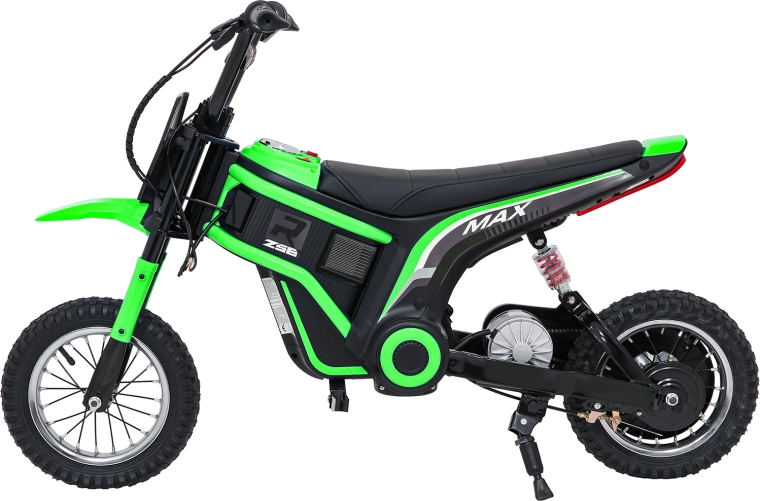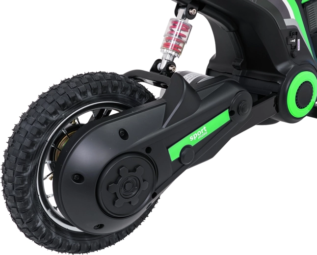 Detská elektrická krosová motorka RZ56 Max v zelenej farbe je ideálna pre mladých jazdcov, ktorí chcú zažiť pravý off‑road. Vďaka výkonnému 350W motoru s reťazovým prevodom a batériovému systému 24V ponúkne svižný záťah, plynulý rozjazd a stabilný výkon. Zadný tlmič a nafukovacie kolesá 30×5 cm zabezpečujú pohodlie a istotu na rôznych povrchoch.