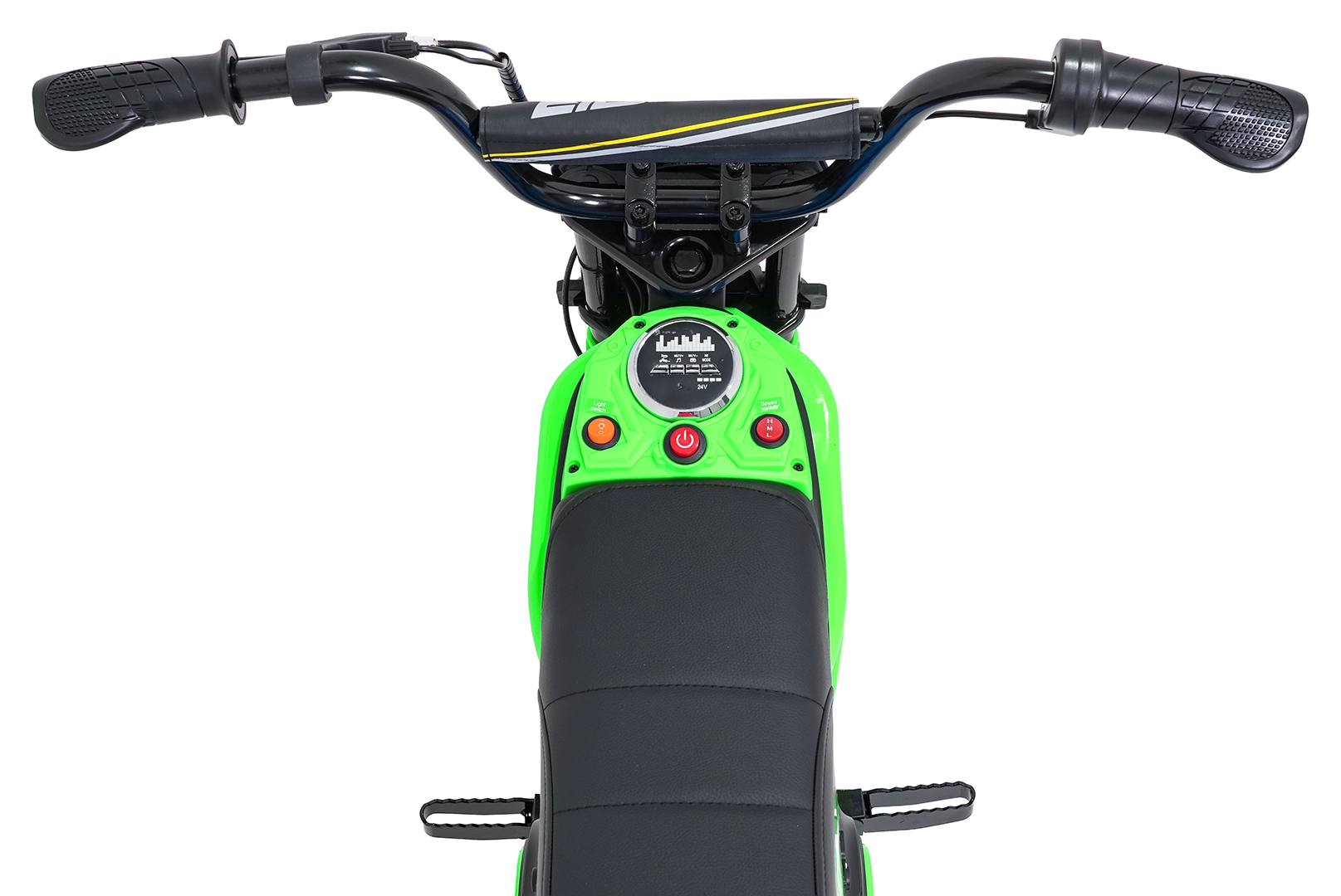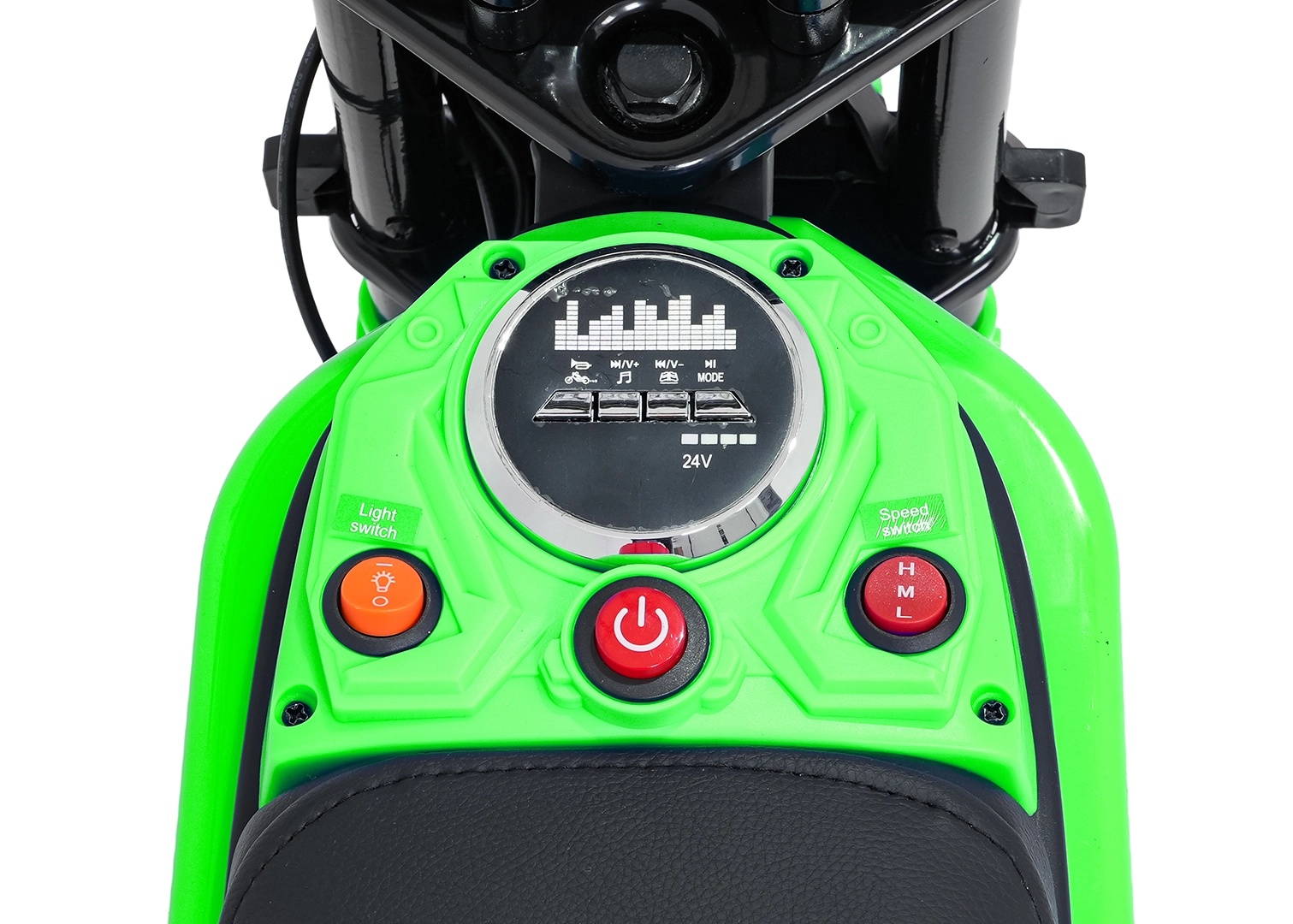 Ovládanie je jednoduché a bezpečné: spustenie tlačidlom, voľba 3 rýchlostí (H/M/L) a prehľadné ukazovatele stavu batérie. LED svetlá zvyšujú viditeľnosť, zatiaľ čo audio panel s Bluetooth, prednahranými melódiami, tlačidlom zvuku a klaksónom sa postará o ďalšiu zábavu. Maximálna nosnosť je 65 kg, takže motorka rastie spolu s jazdcom.