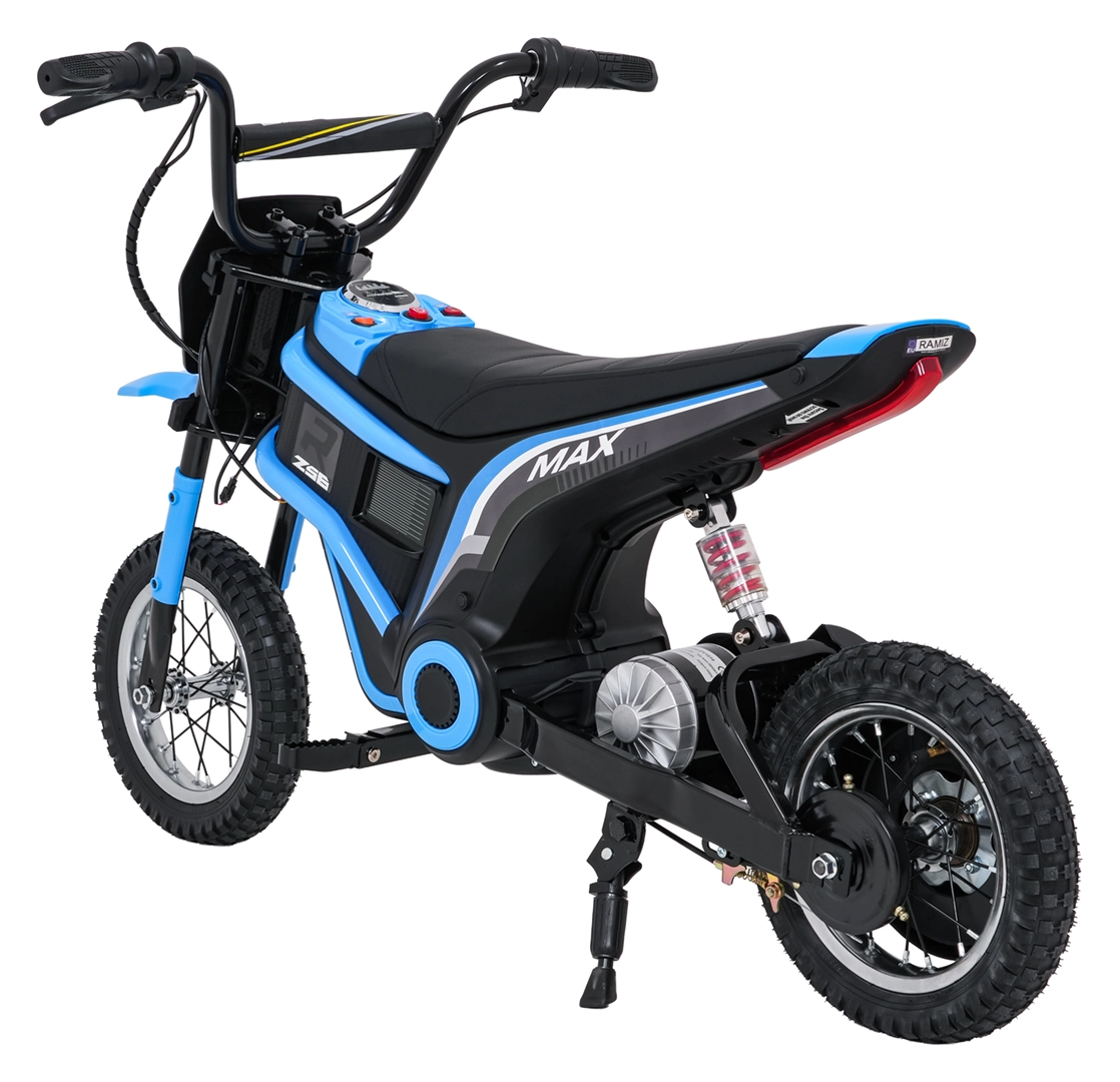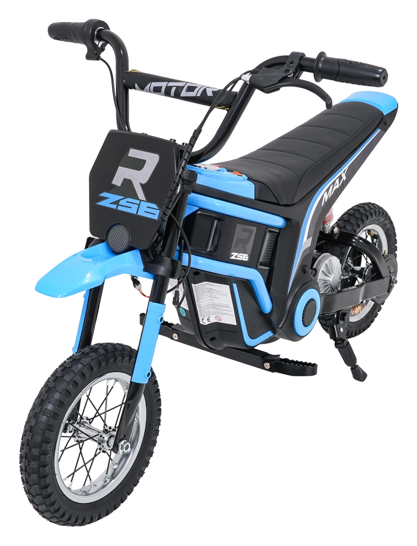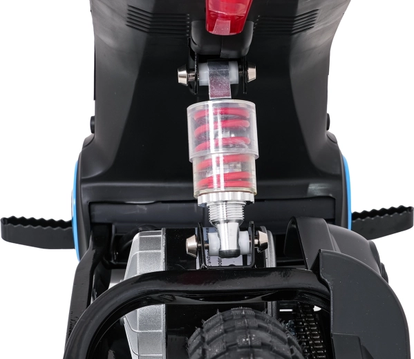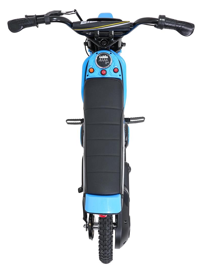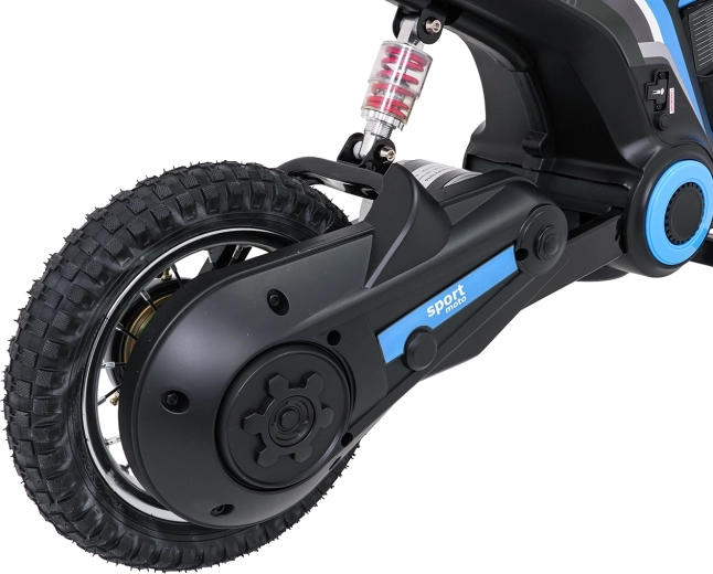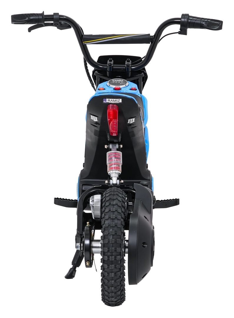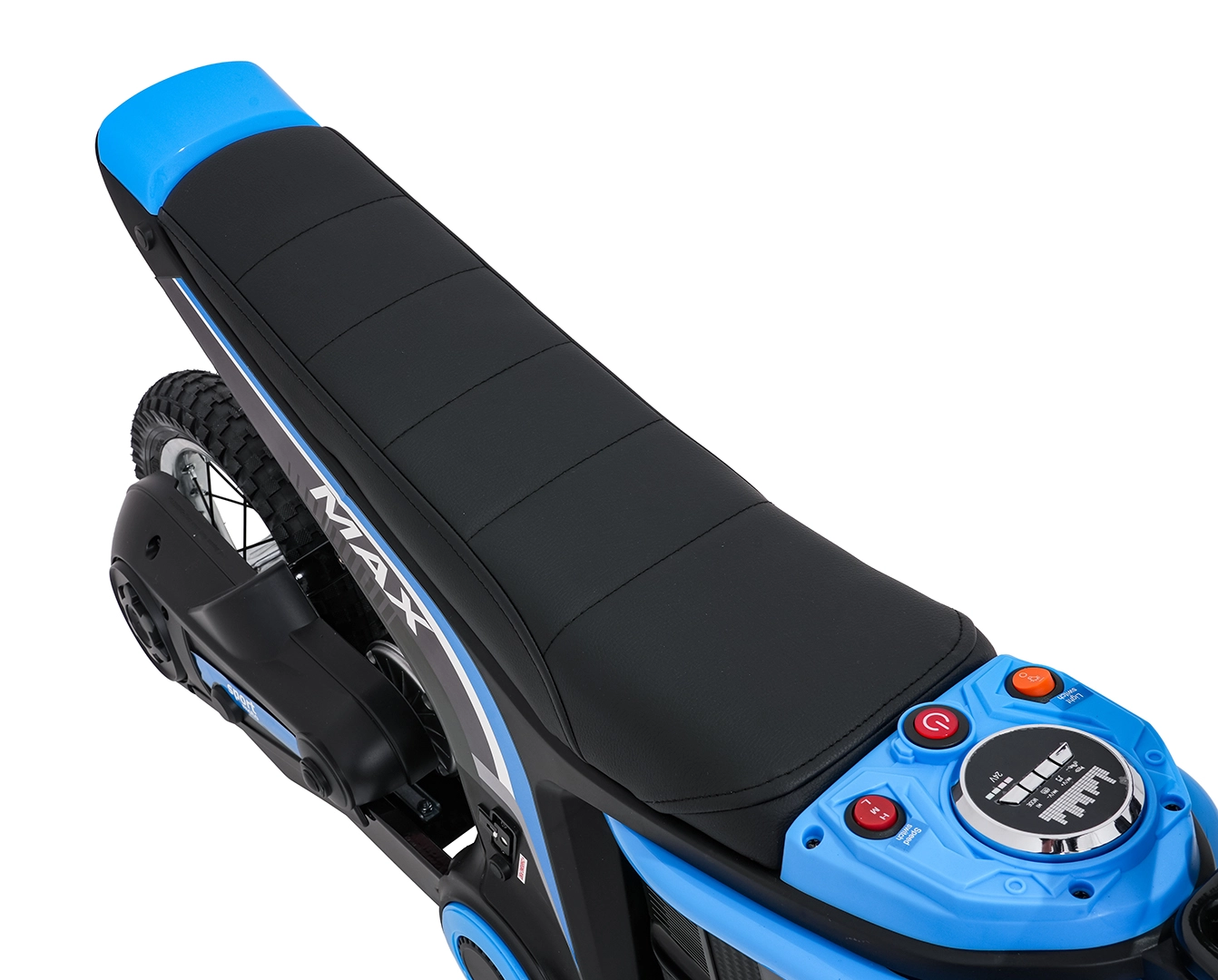 Štýlová detská elektrická motorka RZ56 Max v modrej farbe ponúka silný 350W motor s reťazovým prevodom, dvojitú batériu 24 V (2× 12 V 10 Ah) pre dlhšiu jazdu a nafukovacie off-road pneumatiky 30 × 5 cm pre skvelú priľnavosť. Vďaka 3 rýchlostným režimom, plynulému rozjazdu a pohodlnému sedlu z ekokože je ideálna pre zábavnú a bezpečnejšiu jazdu detí. Nechýba zadné LED osvetlenie, Bluetooth audio panel s melódiami, klaksónom a prehľadným ovládaním na riadidlách.