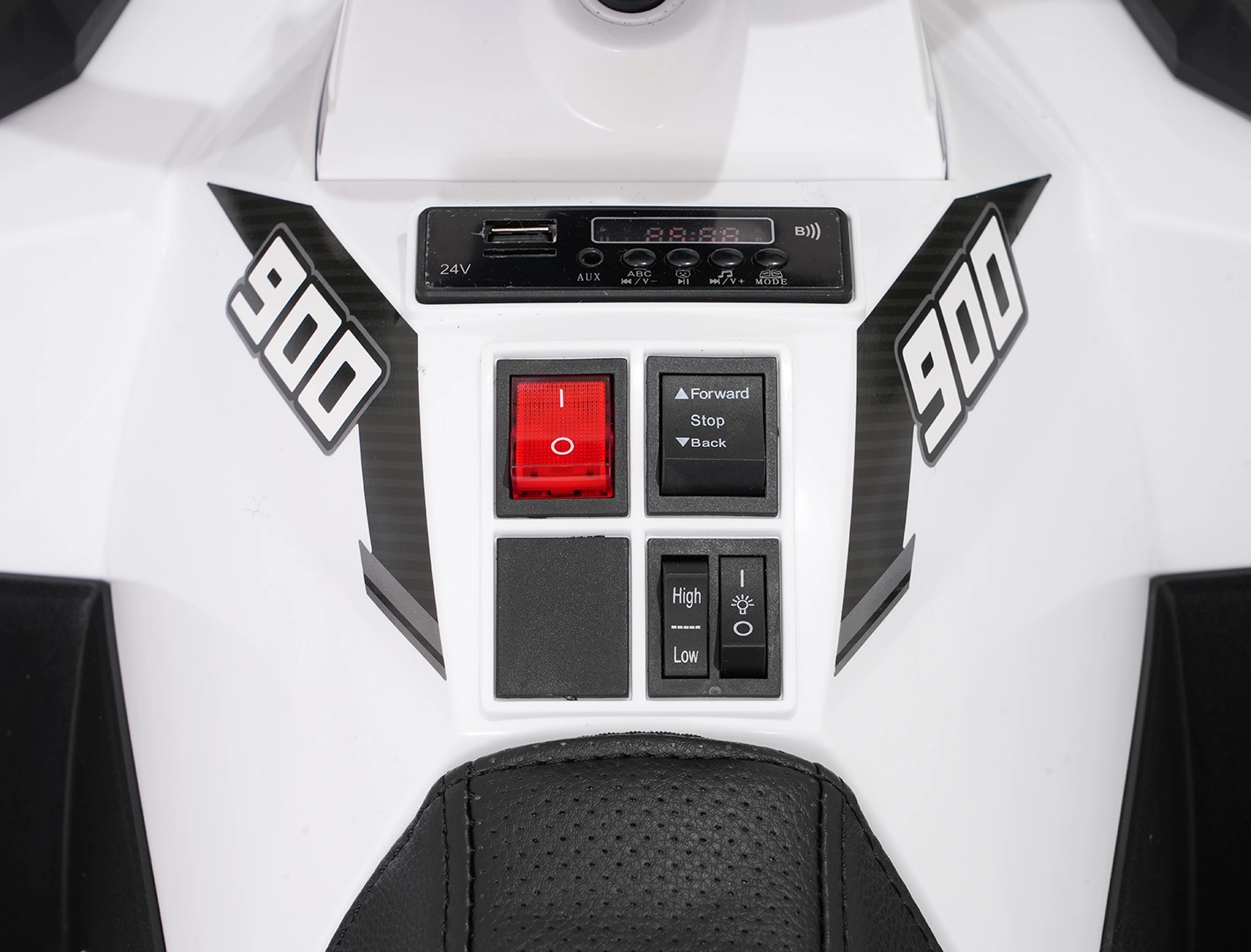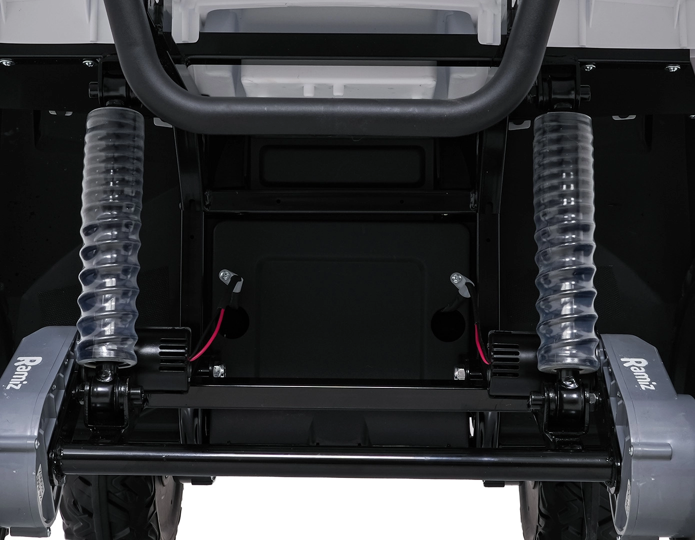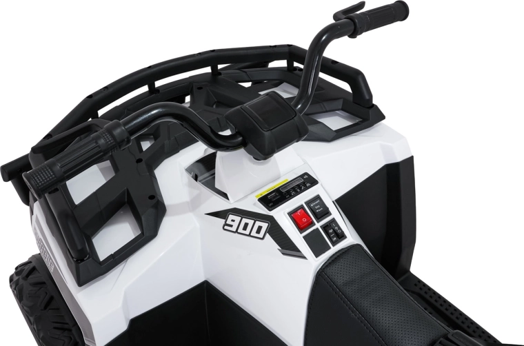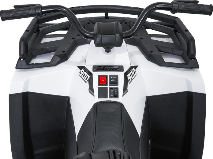 Intuitívne ovládanie dopĺňa praktický rodičovský diaľkový ovládač 2,4 GHz s 3 rýchlosťami a núdzovým tlačidlom Stop. LED predné svetlá zvyšujú viditeľnosť, čalúnené sedadlo z eko kože s bezpečnostnými pásmi sa postará o pohodlie a istotu. Multimediálny panel vie prehrať obľúbené skladby cez USB, SD, AUX aj Bluetooth, k dispozícii sú aj vstavané melódie a indikátor nabitia.