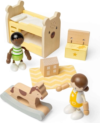 Táto starostlivo spracovaná sada nábytku premení každý domček pre bábiky na útulnú detskú izbu plnú fantázie. Deti môžu ukladať bábiky do poschodovej postieľky, hojdať ich na hojdacom koni, upratovať poklady do truhlice na hračky a aranžovať izbičku pomocou doplnkov vrátane vzorovaného koberca a mini domčeka.