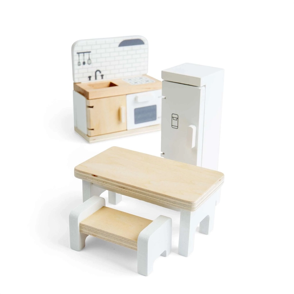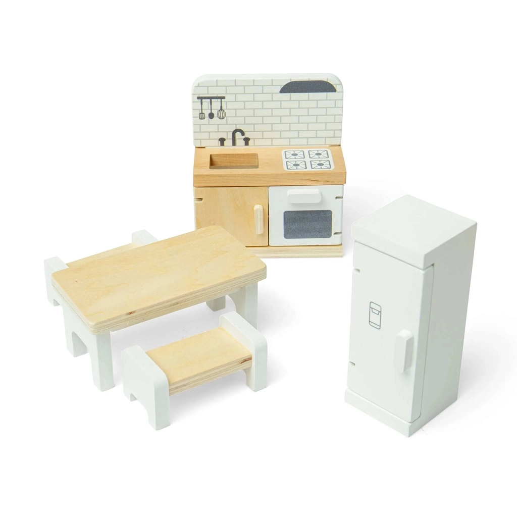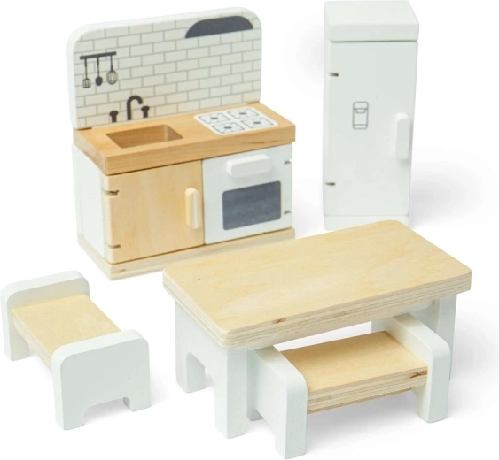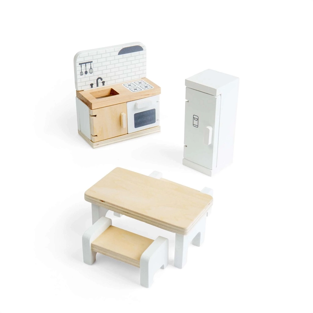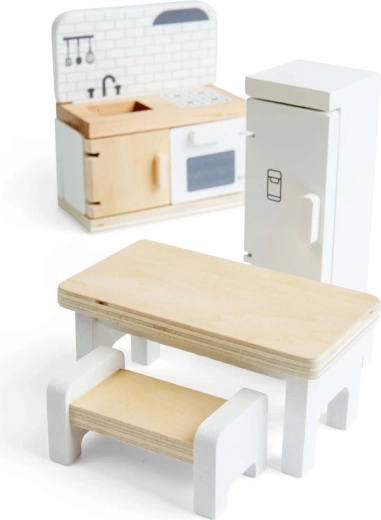 Kvalitné spracovanie z dreva s certifikáciou FSC zaručuje odolnosť pri každodennom hraní a bezpečné, hladké povrchy. Set je kompatibilný s väčšinou bežných domčekov pre bábiky a ľahko ho skombinujete s ďalšími miestnosťami a doplnkami.