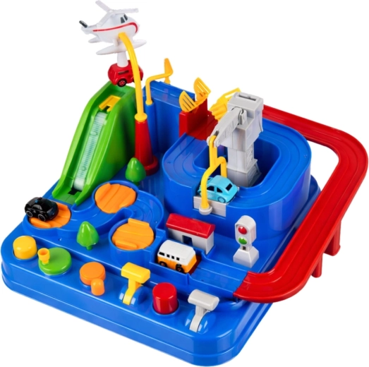 Táto farebná stolová autodráha kombinuje akčnú jazdu s chytrými mechanickými prvkami. Deti pomocou tlačidiel a otočných ovládačov uvádzajú do pohybu 6 interaktívnych mechanizmov, prekonávajú prekážky a plánujú trasu. Vďaka rozmanitým vozidlám a vrtuľníku vznikajú stále nové herné scenáre, ktoré zabavia aj rodičov.