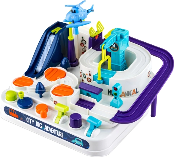 Výťah, most, žeriav, točnice a kľukaté cesty vytvárajú pestrú trasu, ktorá rozvíja logiku, koordináciu a trpezlivosť detí.