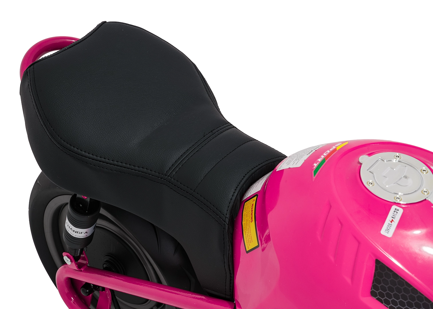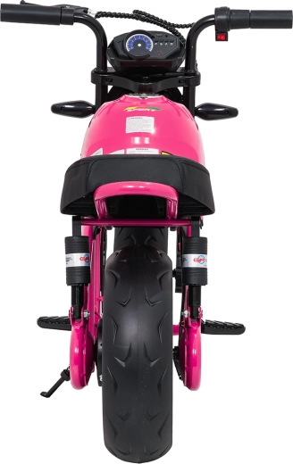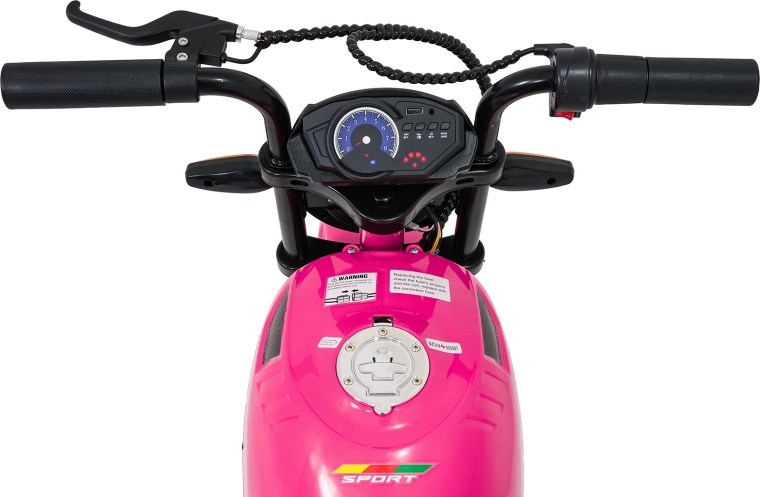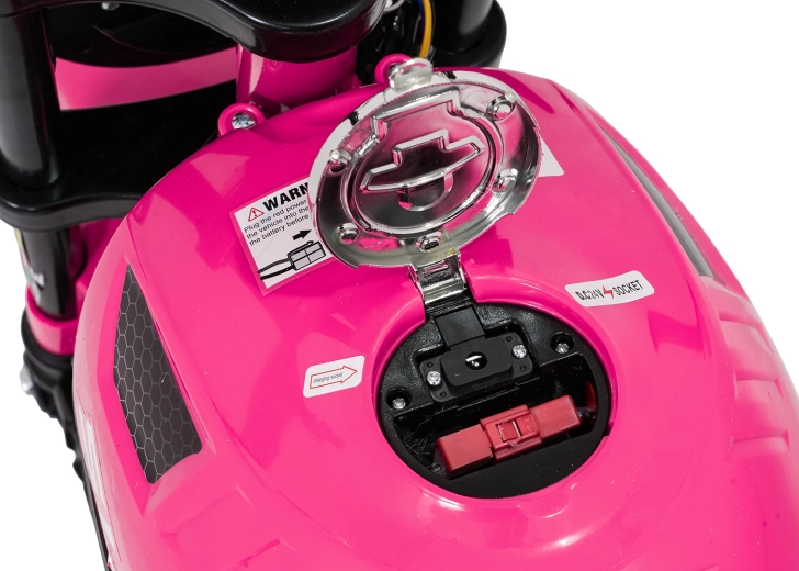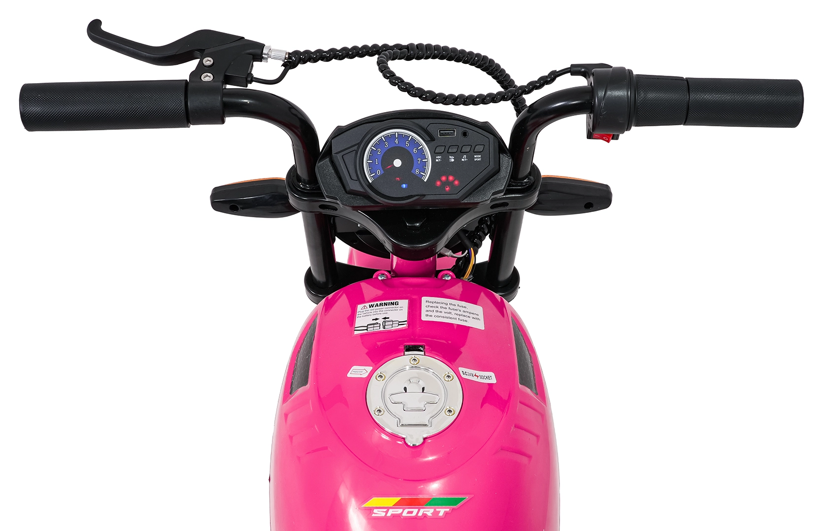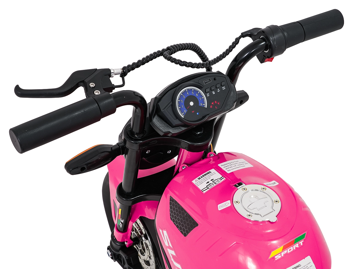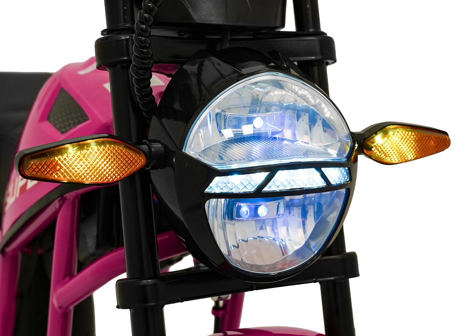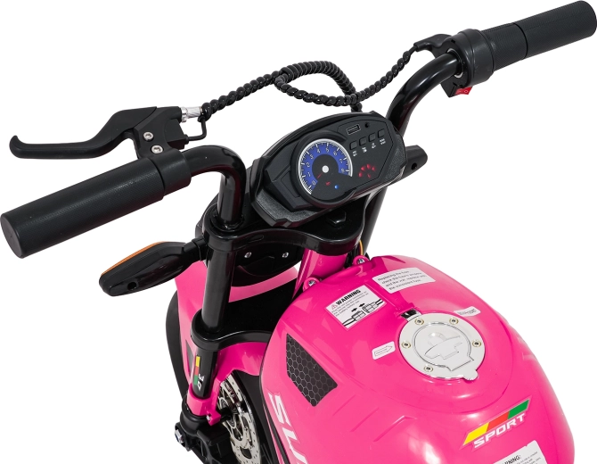 Ružová detská elektrická motorka SUPERMOTO spája športový vzhľad, bezpečnosť aj pohodlie. Silný motor 300 W a batéria 24 V 9 Ah zaistia svižnú a plynulú jazdu, plynulý štart zas pokojný rozjazd bez trhania. Široké EVA kolesá (33×12 cm) zvyšujú stabilitu na rôznych povrchoch a predné LED svetlo s podsvietenou palubnou doskou zlepšia viditeľnosť.