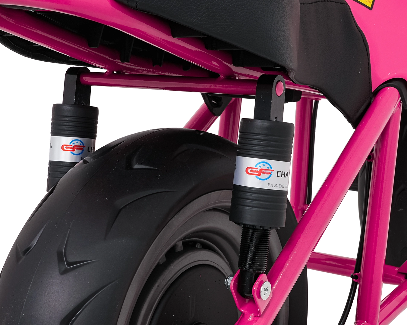 Pre komfort dieťaťa je tu čierne sedlo z eko kože (30×23 cm) a dvojité zadné tlmiče s možnosťou regulácie tvrdosti. Ovládanie je intuitívne – zapnutie tlačidlom, prehľadná prístrojová doska a spínač svetiel. Hudobný panel s Bluetooth, USB, MP3 a AUX poteší malých pretekárov obľúbenými pesničkami.