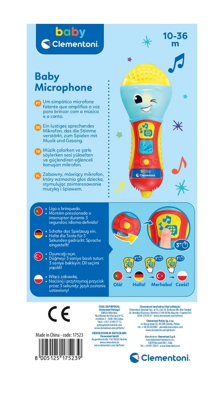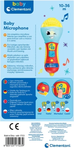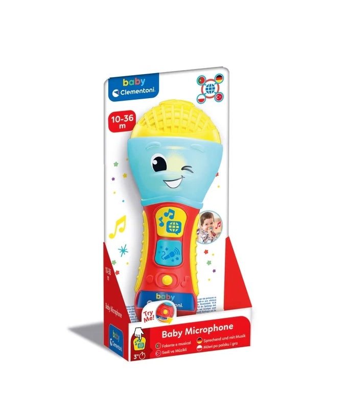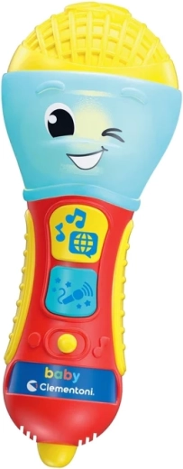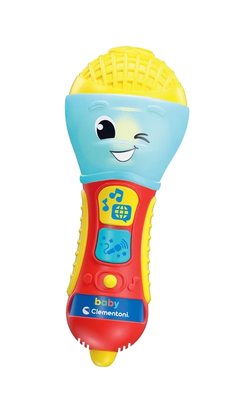 Detský hovoriaci mikrofón CLEMENTONI je skvelá interaktívna hračka pre malých spevákov a speváčky. Prostredníctvom pesničiek, podkresovej hudby a jednoduchých fráz učí prvé písmená a nové slová v 4 jazykoch. Farebná LED dióda a 2 funkčné tlačidlá sa postarajú o pútavú svetelnú šou a zábavné efekty.