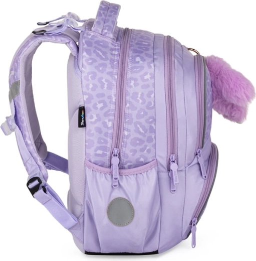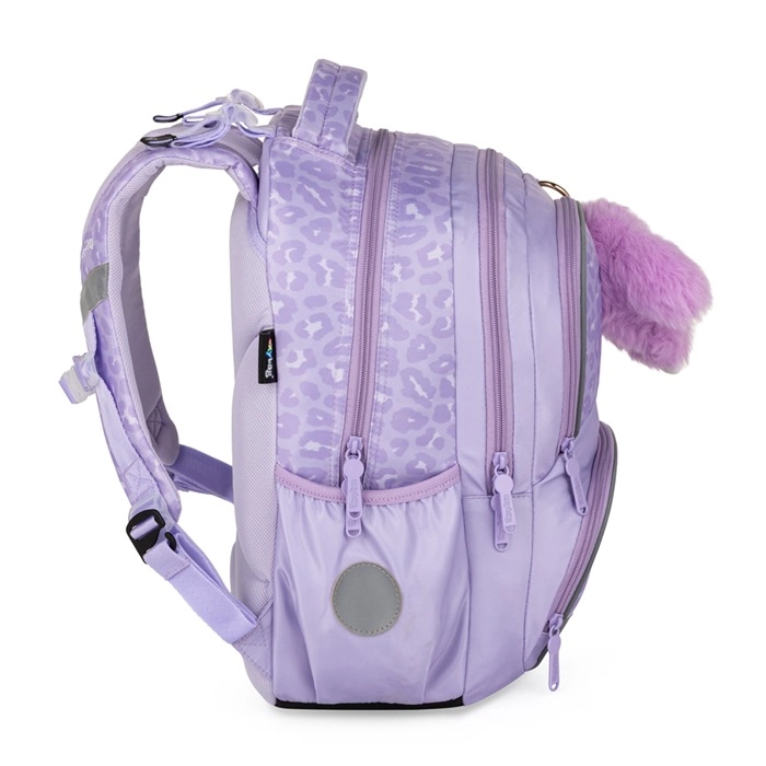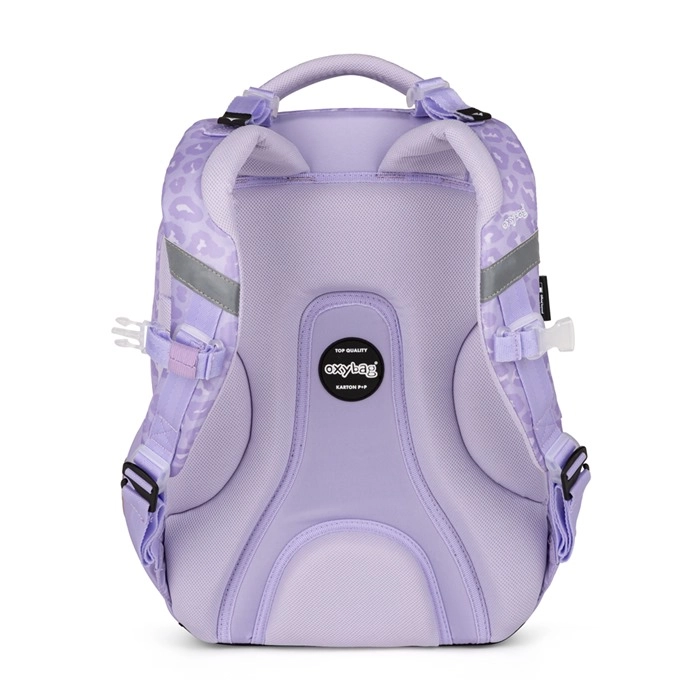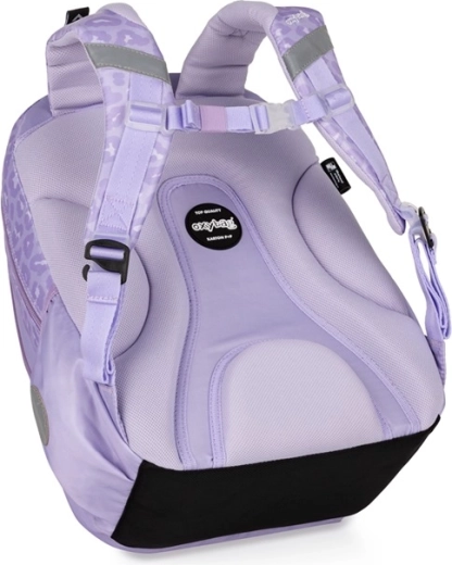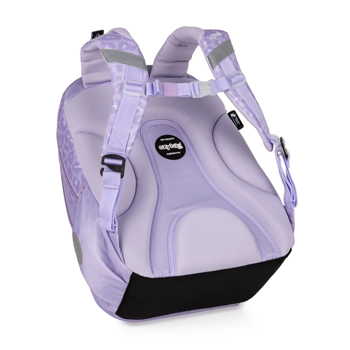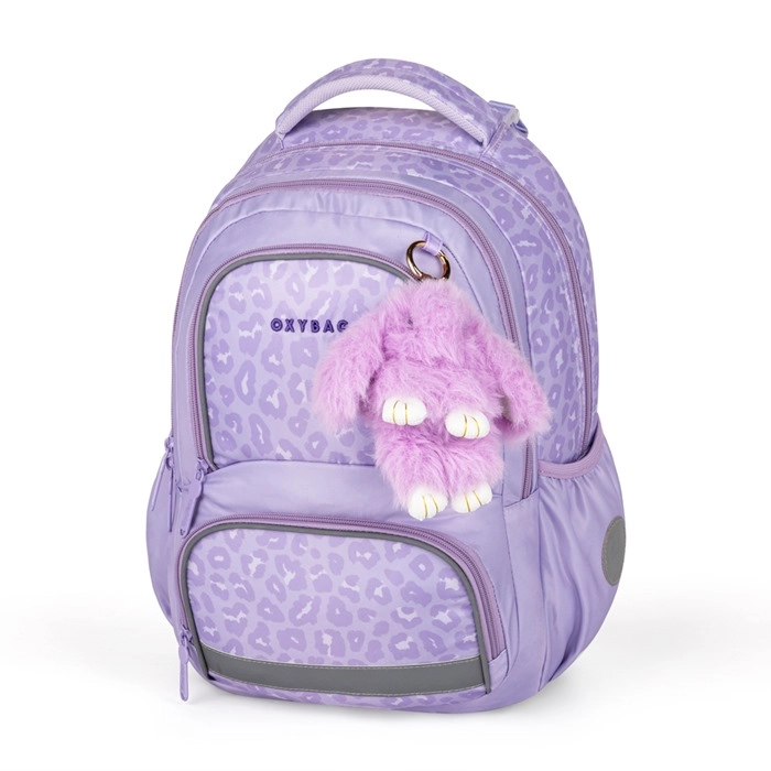 Praktický trojdielny školský set OXY NEXT Bunny v jemnej levanduľovej farbe kombinuje priestranný batoh, veľký peračník a ľahké vrecko na cvičky. Batoh má anatomicky tvarovaný chrbát, polstrované ramenné popruhy a hrudný popruh pre pohodlné a zdravé nosenie. Ponúka množstvo vreciek a organizér, bočné vrecká na fľašu, držiak na kľúče/čip a reflexné prvky pre bezpečnosť. Spevnené nepremokavé dno chráni obsah aj v nepriaznivom počasí.