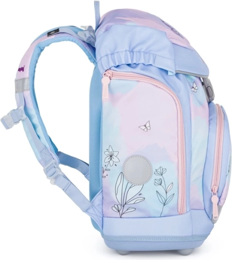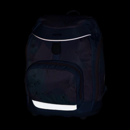 Batoh pre 1.–3. ročník je navrhnutý s dôrazom na správne držanie tela – má anatomicky tvarovaný chrbtový panel (cca 33 cm), polstrované a nastaviteľné ramenné popruhy i hrudný popruh. Stabilitu zaisťuje pevné dno s plastovými nožičkami, ktoré bráni prevráteniu. Praktické riešenie ponúka vnútorný rozdeľovač, predné vrecko na desiatu a bočné vrecká na fľašu. Hlavná komora sa zatvára sťahovacou šnúrkou a magnetickým zapínaním pre rýchle a bezpečné používanie. Viditeľnosť dieťaťa zvyšujú reflexné prvky.