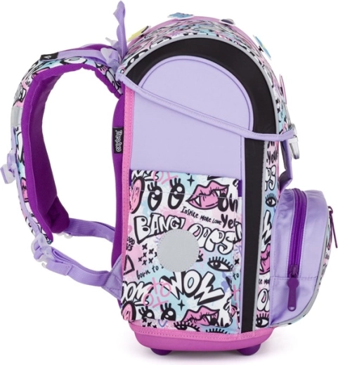 Hlavná komora je priestranná a prehľadná pre všetky školské pomôcky, predné vrecko je ideálne na desiatu. Reflexné prvky a bezpečnostná kovová pracka s odrazkou zvyšujú viditeľnosť dieťaťa. Súčasťou setu je jednoposchodový peračník s dvoma chlopňami a gumenými pútkami na písacie potreby a ľahké vrecko so šnúrkou (sáčok) na cvičky či prezuvky.