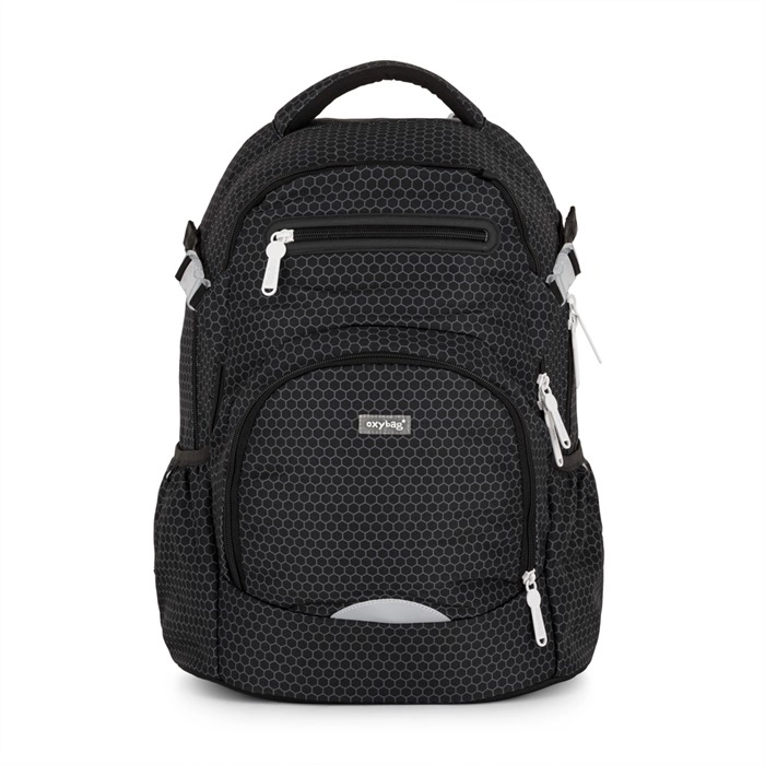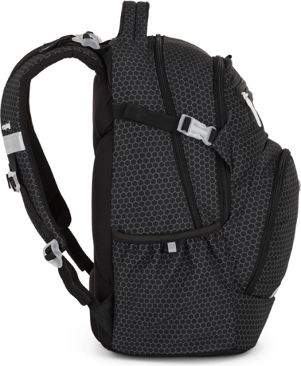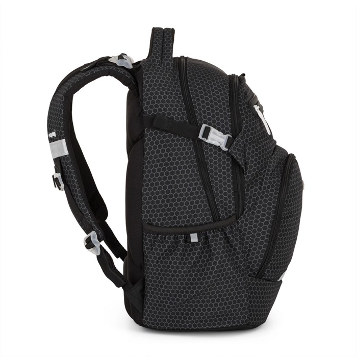 Dve priestranné hlavné komory ľahko pojmú zošity, učebnice aj peračník, do predného vrecka sa zmestí menšia desiata alebo drobnosti. Bočné sieťované vrecká s gumou sú ideálne na fľašu s pitím, ktorú má školák vždy poruke. Pevné dno umožňuje, aby batoh stabilne stál a neprevracal sa, zatiaľ čo reflexné prvky zvyšujú viditeľnosť a bezpečie za šera.