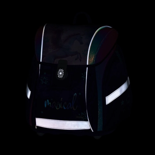 Reflexné prvky pre lepšiu viditeľnosť, magnetické zapínanie pre rýchly prístup a vnútorný rozdeľovač s vreckami pre poriadok v školských potrebách.