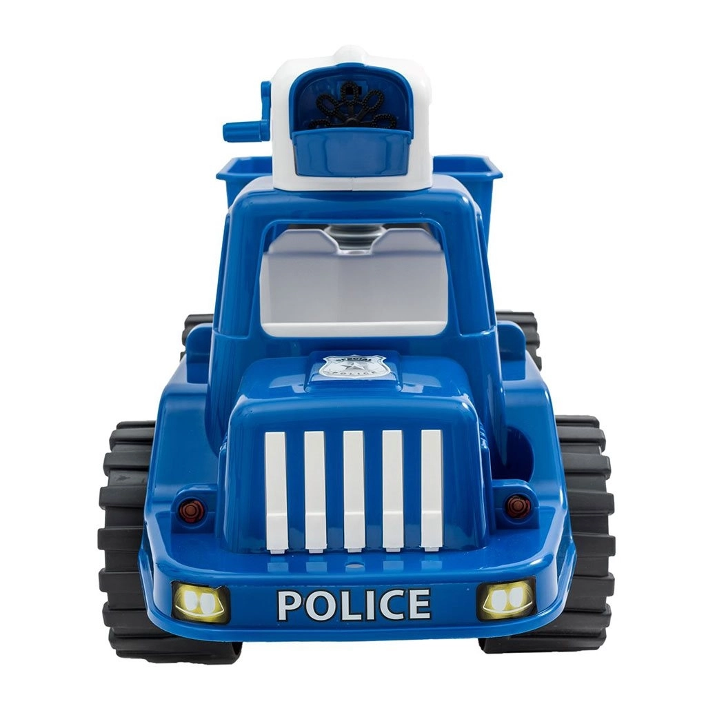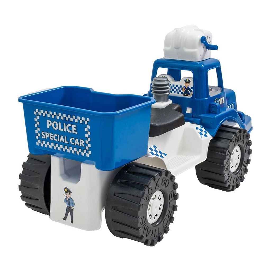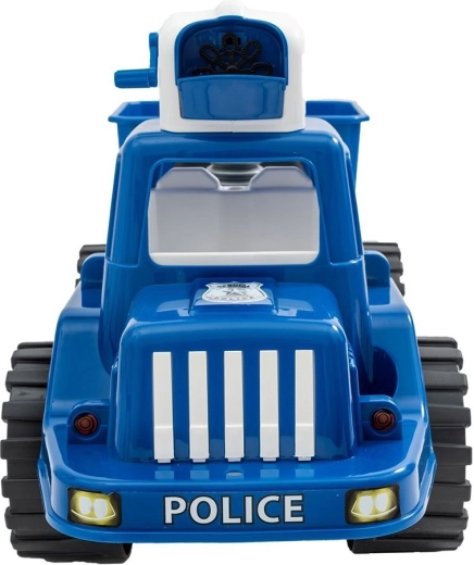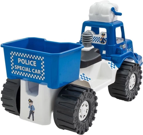 Pod sedadlom je praktický box na hračky alebo bublinkový roztok, aby mal malý policajt všetko po ruke aj na dlhších výpravách.