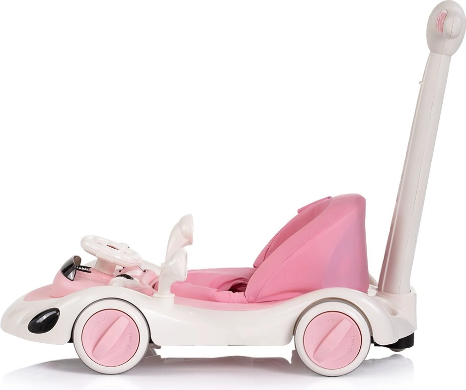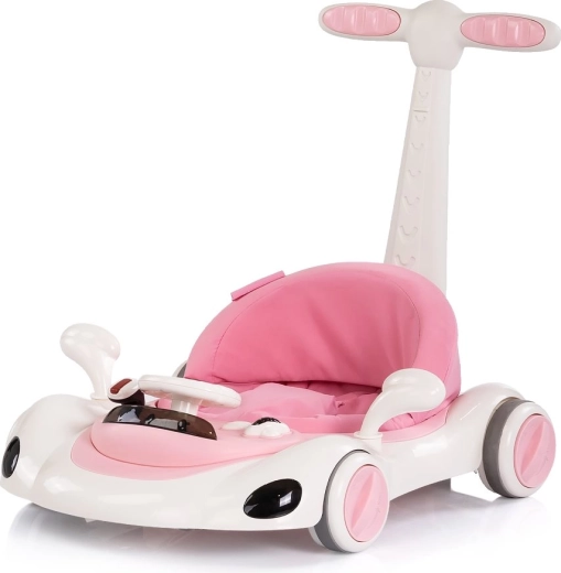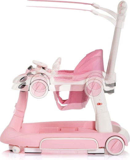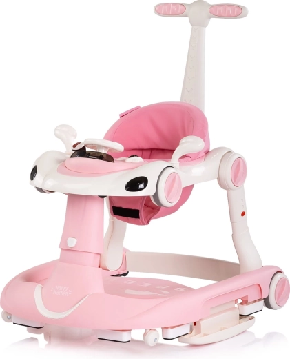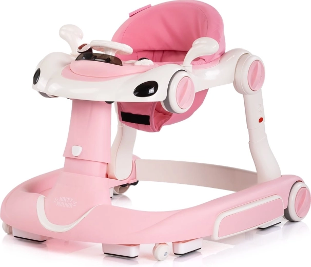 Univerzálne chodítko 5v1 CHIPOLINO Happy Walker v ružovej farbe podporí prvé krôčiky a zábavné objavovanie sveta. Ponúka stabilnú konštrukciu, interaktívny hrací panel so svetlami a hudbou, nastaviteľnú výšku aj rodičovskú rukoväť na bezpečné vedenie. Vďaka kolísaciemu a skákaciemu režimu, protišmykovým podložkám, brzdam a aretácii koliesok je vhodné na každodenné používanie a rozvoj rovnováhy, koordinácie i motoriky.