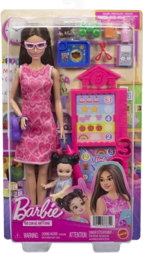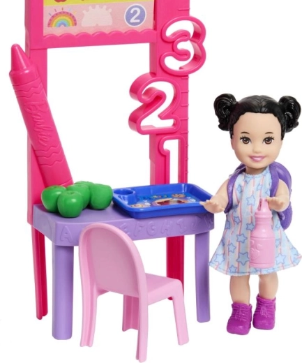Súčasťou setu je bábika Barbie v roztomilých šatách, malá bábika žiačika, stolička, batôžtek, tácka, lepidlo, kniha, plyšový medvedík a ďalšie školské rekvizity. Vďaka ľahko uchopiteľným doplnkom a odnímateľným prvkom je hranie jednoduché a zábavné pre deti od 3 rokov.