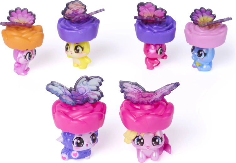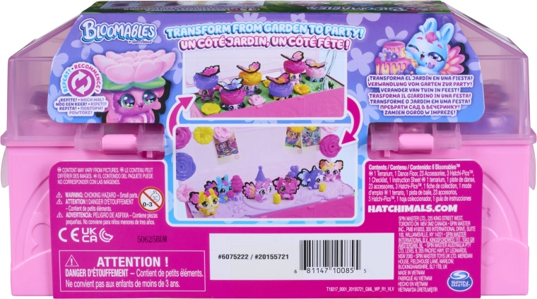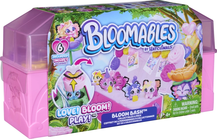Vstúpte do sveta fantázie so zberateľskou sadou Hatchimals Bloomables Bloom Bash. Stačí naliať vodu do srdca herného kufríka a kvety začnú „rásť“, aby odhalili ukryté postavičky – od mer‑jednorožca cez zajačika až po psíka. Po odhalení premeníte kufrík na tanečný parket, pripnete figúrkam farebné krídelká a ozdobíte veko fotkami Hatchi‑Pics.