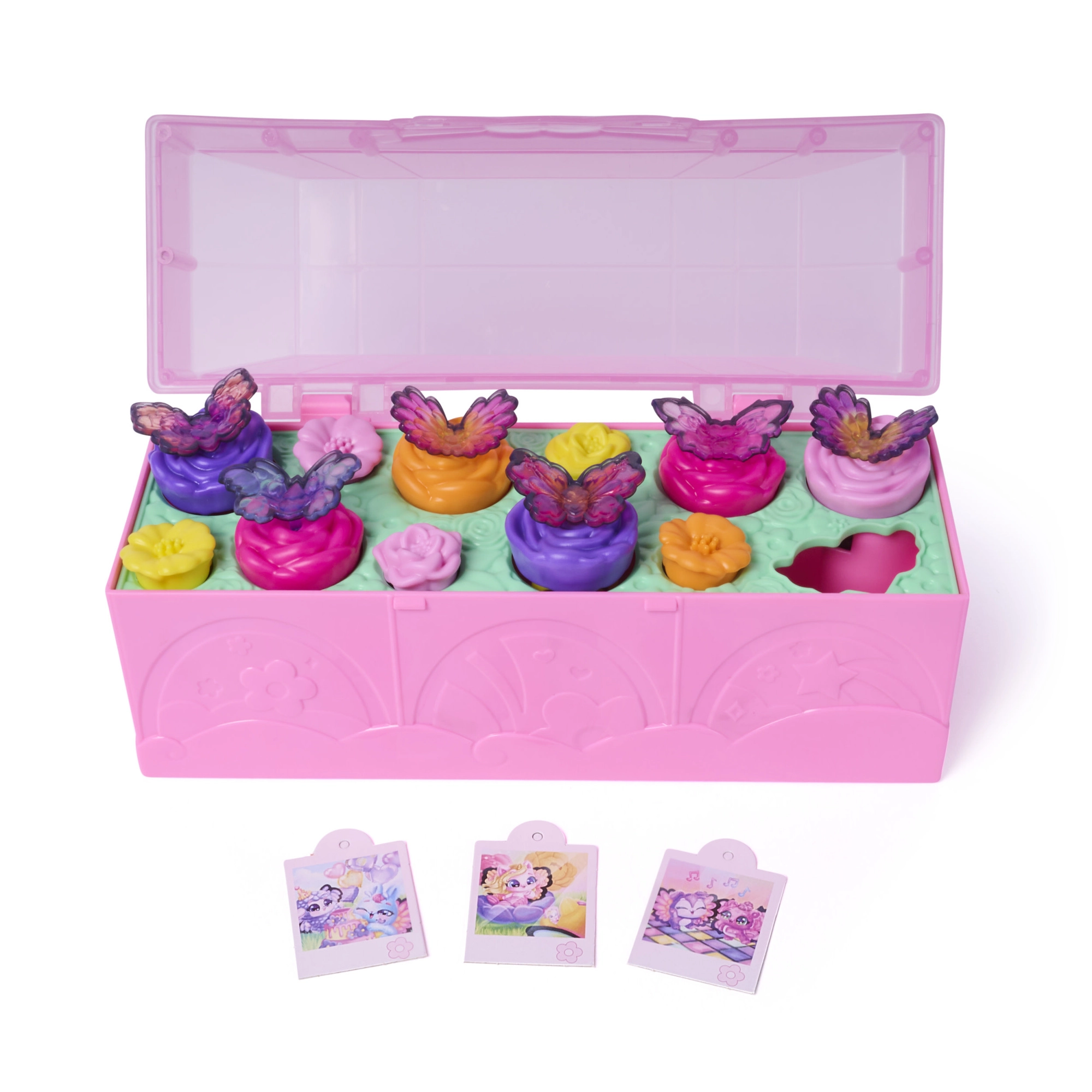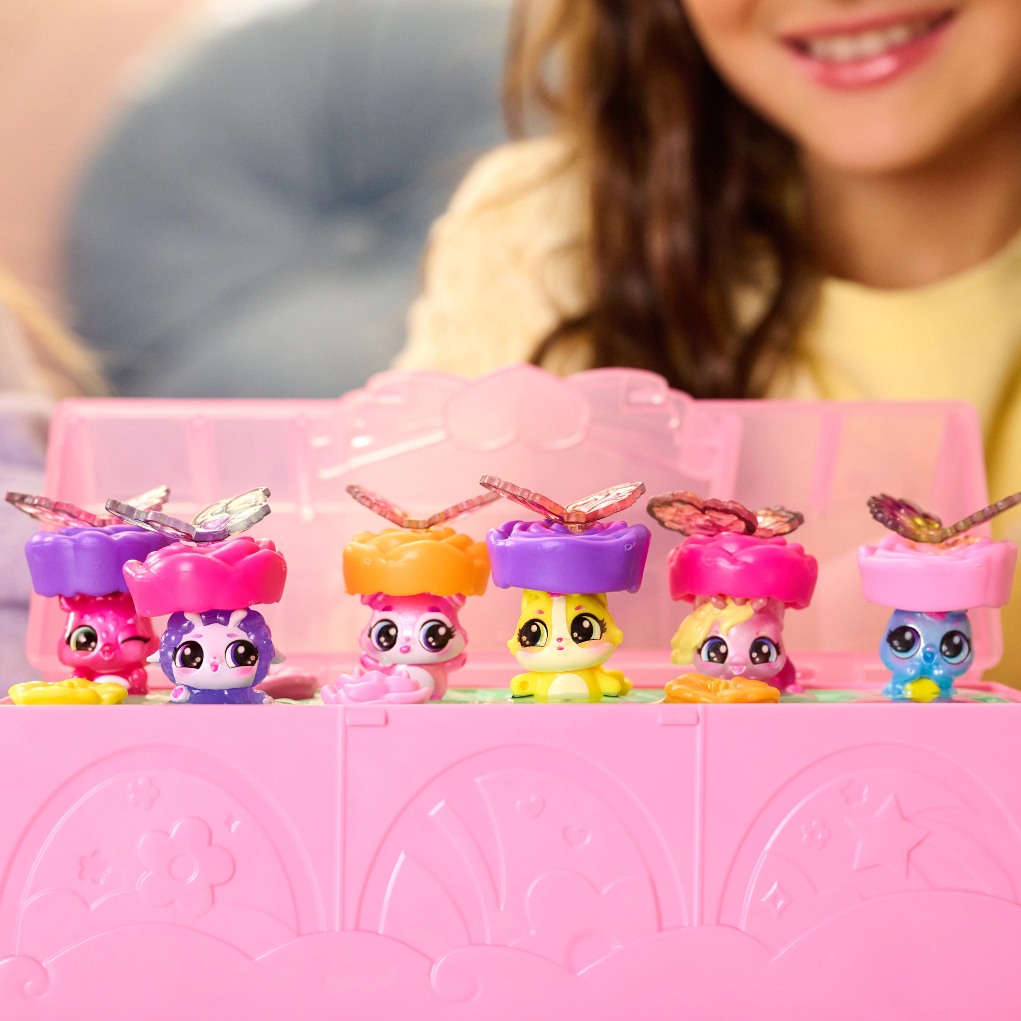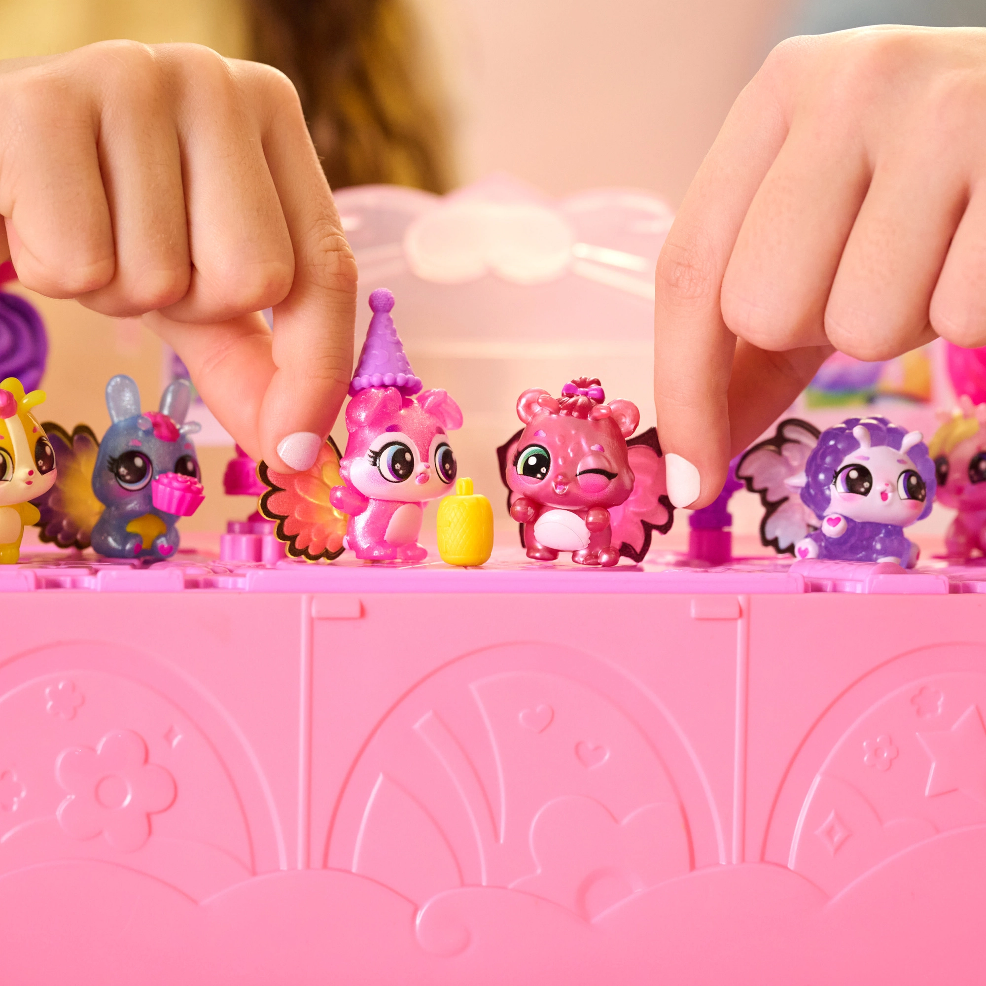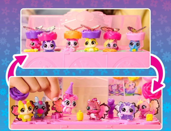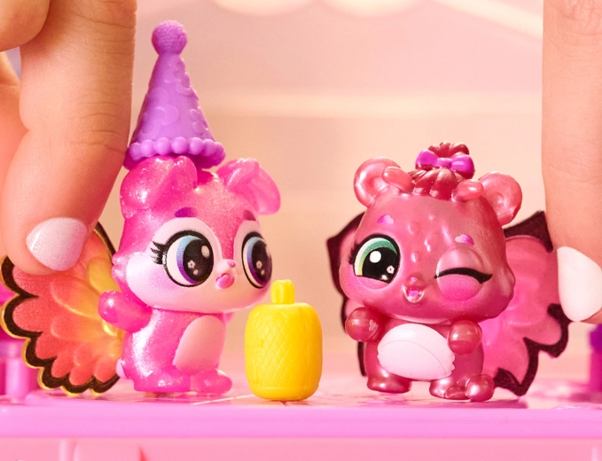Po odhalení premeňte set na tanečný parket, pripnite figúrkam farebné krídelká a dozdobte veko fotkami Hatchi‑Pics. Zábava začína!