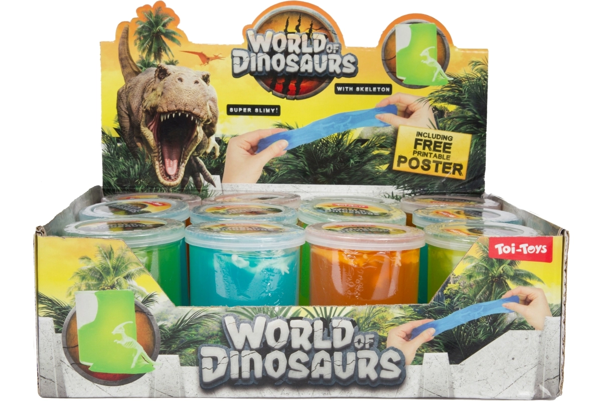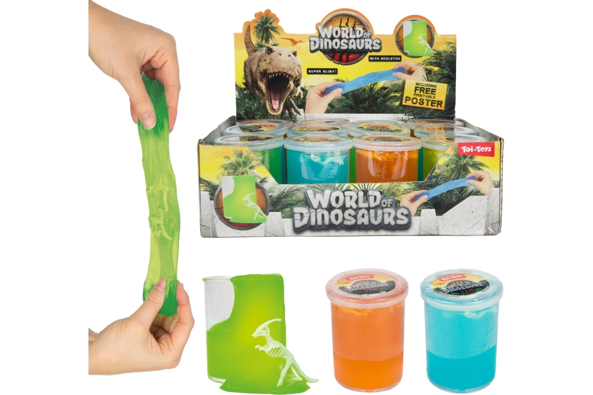 Tento sliz s dinosaurou tematikou prináša deťom dvojnásobnú dávku zábavy: nielenže je príjemne ťahavý, mäkký a tvarovateľný, ale navyše v sebe skrýva miniatúrnu kostru dinosaura, ktorú môžu deti postupne objavovať. Ideálny na domáce hranie, do škôlok aj ako drobný darček.