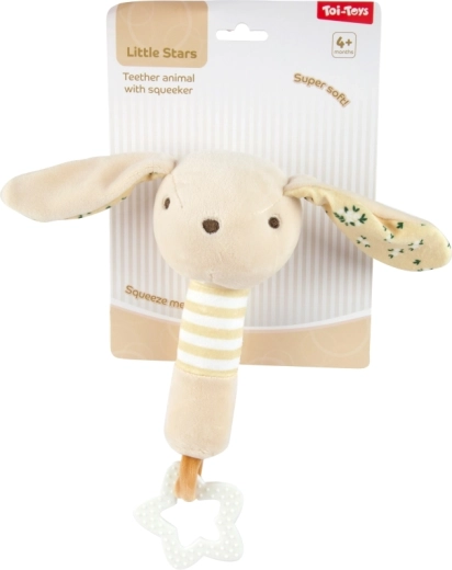 Béžový zajačik s dlhými uškami a mäkkým telom jemne hrká, šuští a láka na stláčanie. Ľahká konštrukcia a hviezdičkové hryzátko sú ideálne pre bábätká od 4 mesiacov.