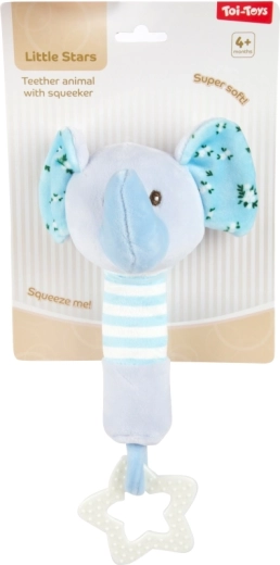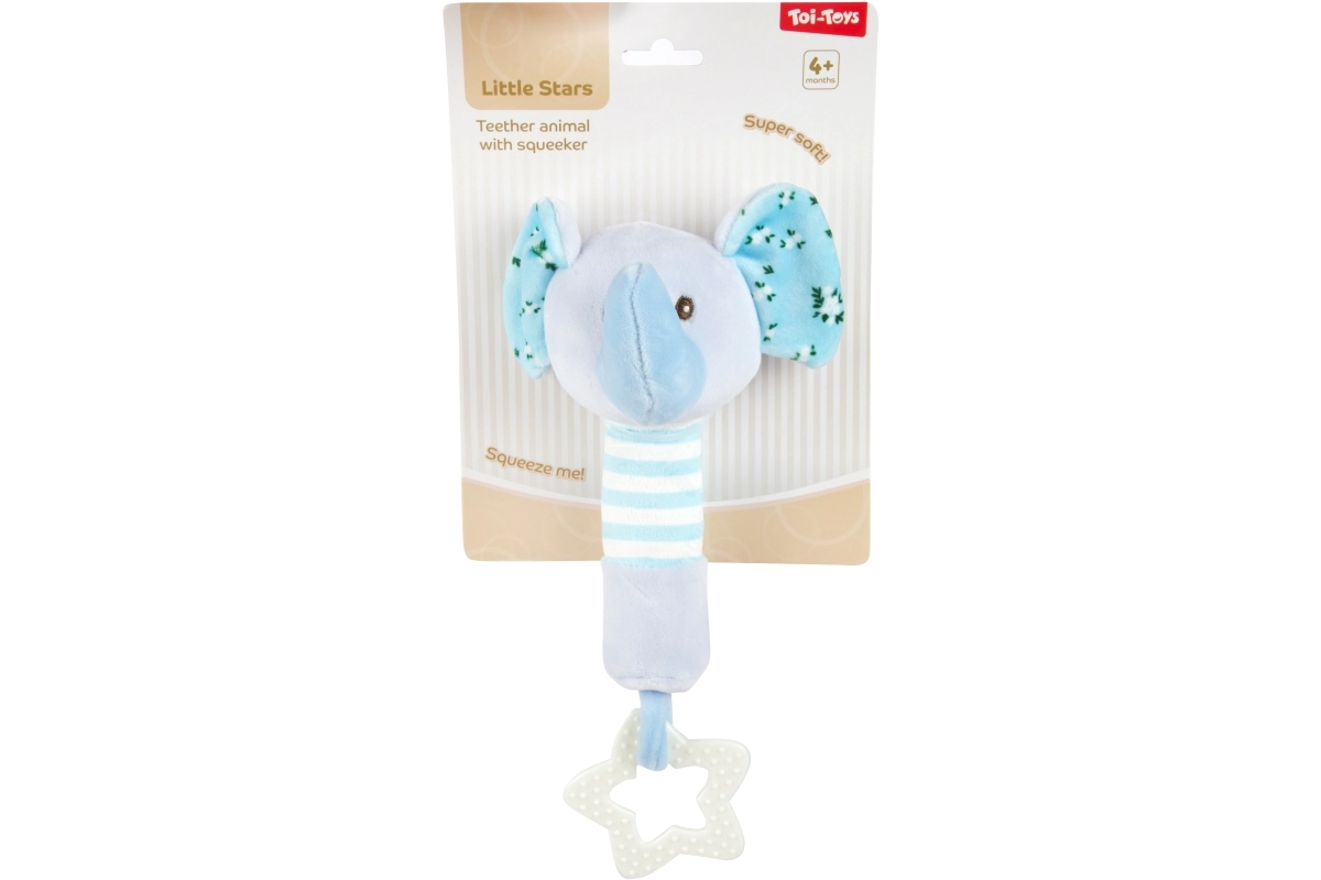 Plyšový slon v jemne modrej farbe má šuštiace ušká, pruhované držadlo a hviezdičkové hryzátko, ktoré uľavuje ďasnám. Integrovaná pískacia hračka podporuje zábavnú interakciu.