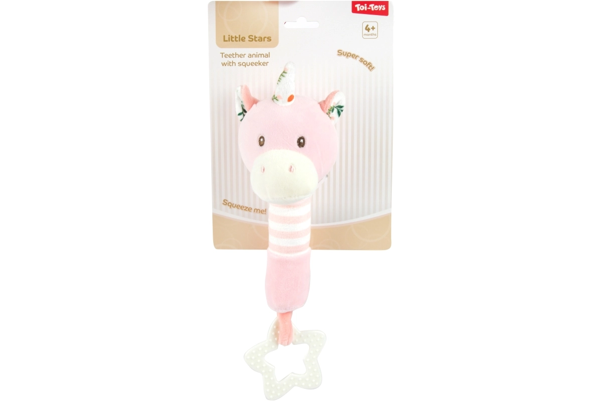 Sladučký ružový motív s mäkučkým telom a pískacou hračkou zaujme každé bábätko. Hviezdičkové hryzátko prináša úľavu pri prerezávaní zúbkov kedykoľvek počas dňa.