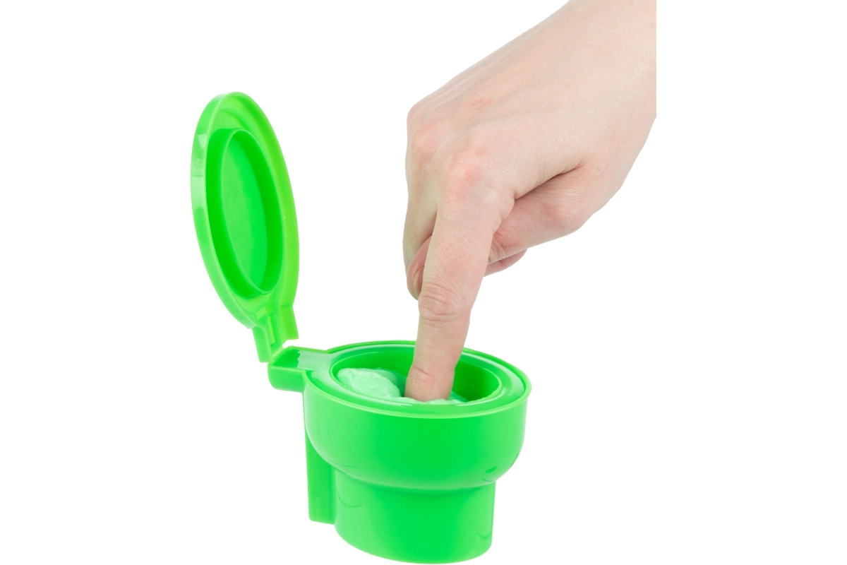 Praktický plastový kontajner v tvare záchodu s výklopným viečkom udrží sliz čerstvý a pripravený na ďalšie hranie doma aj na cestách.