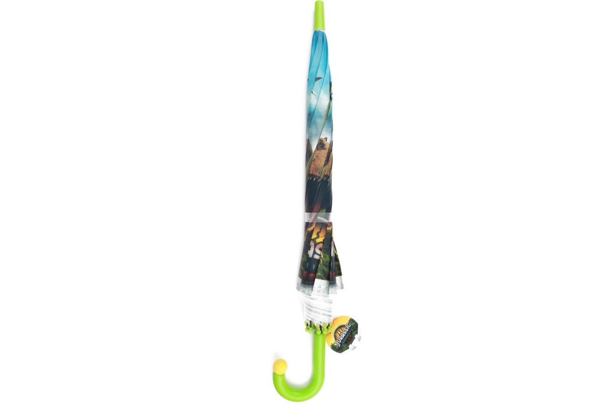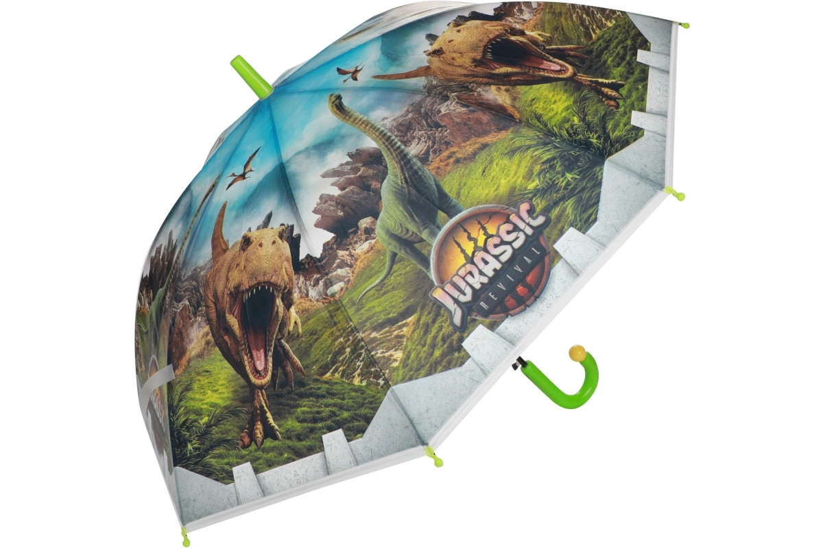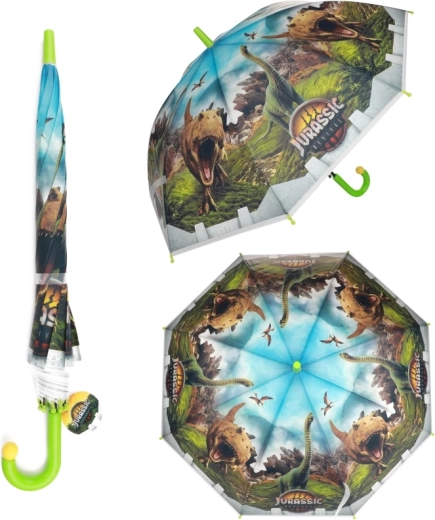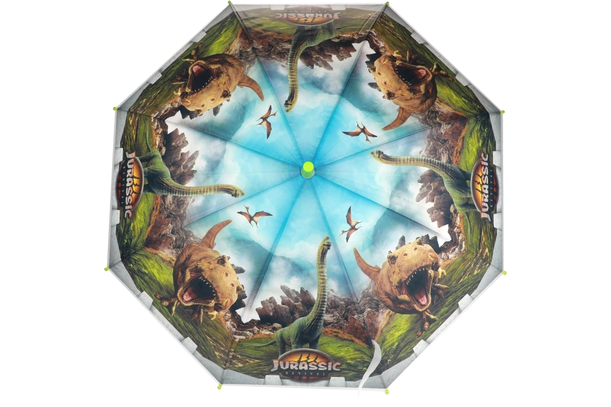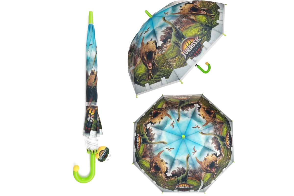 Objavte zábavný a praktický doplnok do dažďa: detský dáždnik s motívom dinosaurov a logom Jurassic World. Pestrofarebná potlač, odolná viacdielna látková kupola a kovové rebrá zaistia, že dieťa zostane v suchu a zároveň si užije originálny dizajn.
