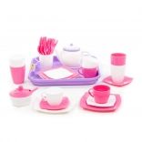 - Sada obsahuje: tácka, 4 hrnčeky, 4 podtácky, 5 pohárikov, cukornička, 4 taniere, 4 lyžičky, 4 vidličky, 4 nože, kanvica