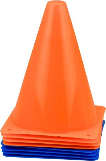 Kužele v sýtej oranžovej a modrej farbe pomáhajú deťom lepšie sledovať dráhu a zvyšujú bezpečnosť tréningu na ihrisku aj na záhrade.