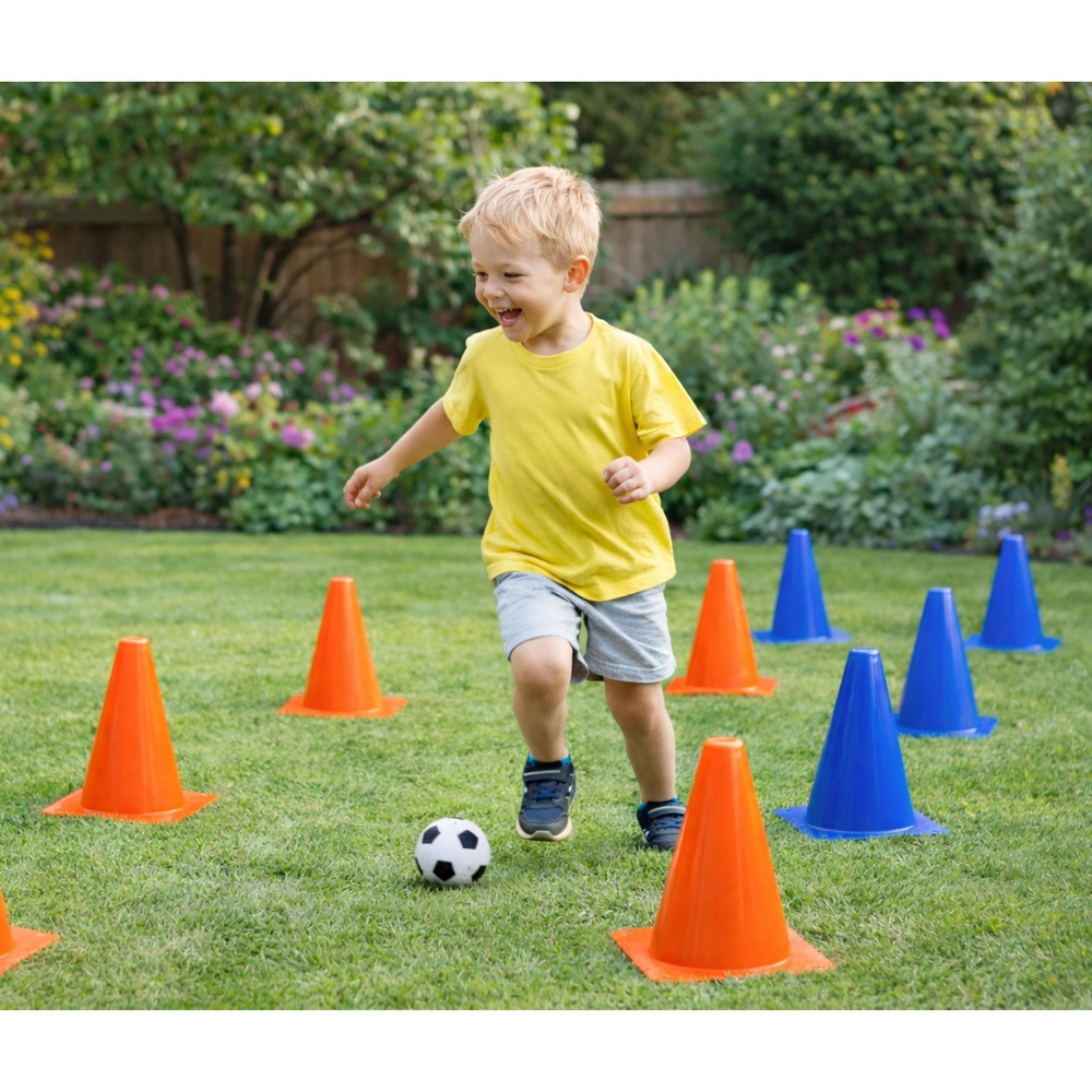 Táto univerzálna tréningová sada podporí koordináciu, rovnováhu aj rýchlosť detí. Vďaka výrazným farbám sú kužele skvele viditeľné na tráve, ihrisku aj v telocvični a loptička s priemerom 8 cm sa hodí na slalom, cielené prihrávky aj tímové hry. Odolné plastové prevedenie zaisťuje bezpečné a dlhodobé používanie.