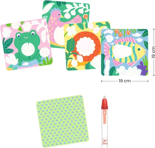 Vodné omaľovánky Djeco prinášajú deťom čarovný zážitok: na prvý pohľad nenápadné obrázky sa po kontakte s vodou premenia na farebnú scénu plnú zvieracích kamarátov. Keď kartičky uschnú, farby zmiznú a zábava môže začať znova.