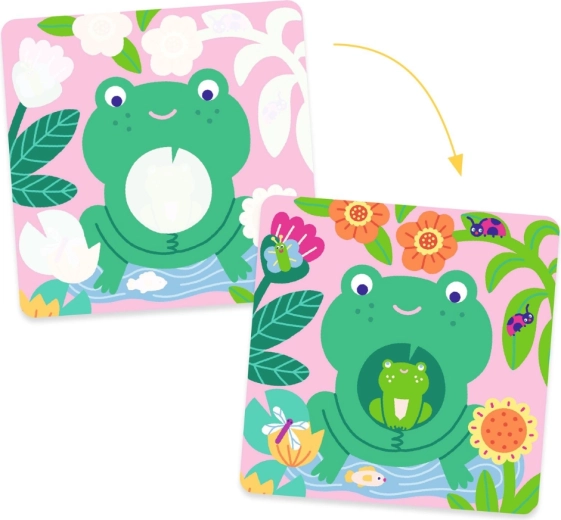 Pevné štvorcové karty s rozkošnými motívmi žabky, rybky, slimáčika a vtáčika vydržia opakované maľovanie a ľahko sa udržiavajú.