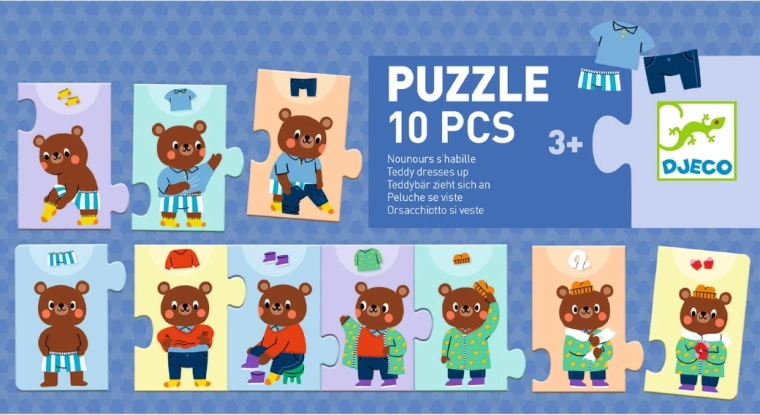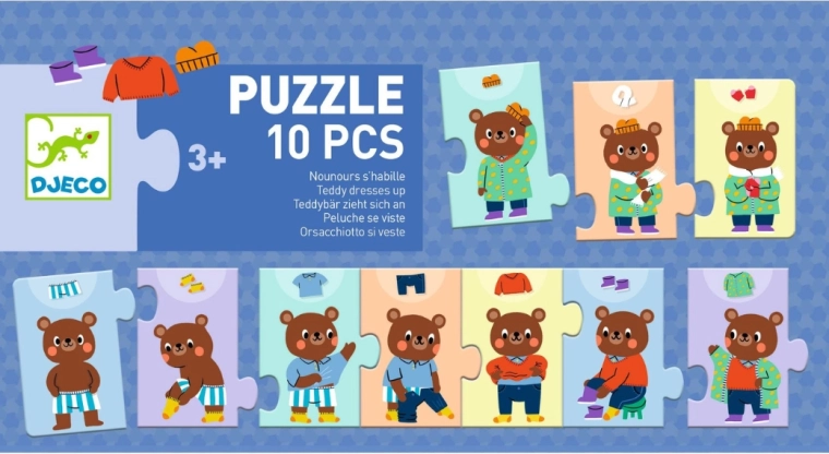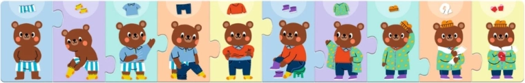 Zábavné detské puzzle, v ktorom deti skladajú, ako sa medvedík postupne oblieka. Ideálne na rozvoj jemnej motoriky, logiky a poradia krokov. Obsahuje 10 pevných dielikov, kvalitný kartón a ilustrácie, ktoré deti bavia.