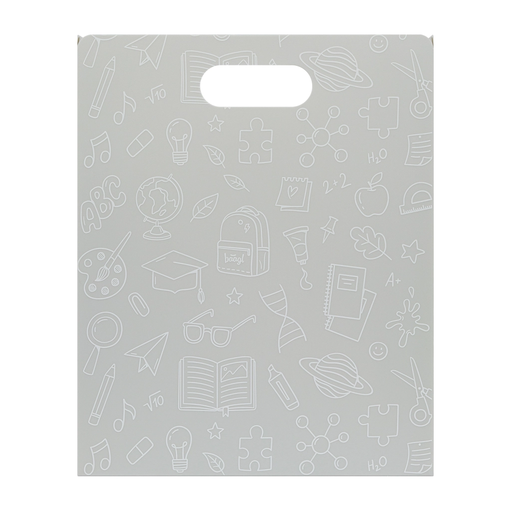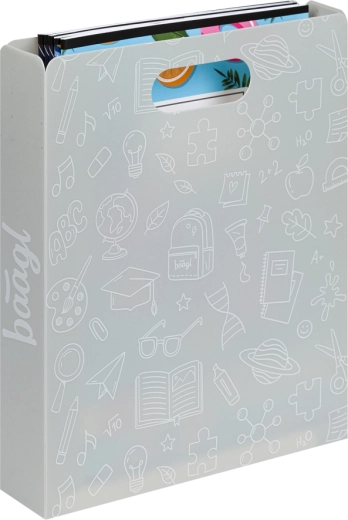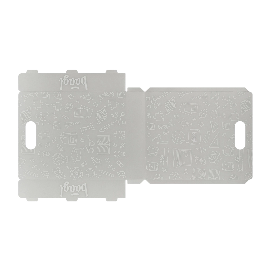 Praktické skladacie dosky BAAGL zo 100 % recyklovaného polypropylénu udržia poriadok v učebniciach, zošitoch aj pracovných listoch. Sú ľahké (menej než 140 g), odolné a vďaka pevnej konštrukcii chránia obsah pred vlhkosťou aj poškodením. Polopriesvitný materiál uľahčí rýchlu orientáciu a praktické ucho zabezpečuje pohodlné vybratie z batohu aj prenášanie.