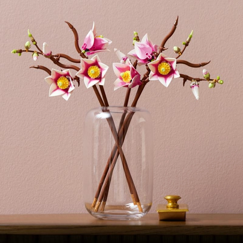 Táto dizajnová sada z kolekcie LEGO Botanicals poteší milovníkov prírody aj moderného interiéru. Päť vetvičiek magnólie prechádza od drobných pukov až po plne rozkvitnuté kvety, ktoré možno naaranžovať do vázy a vystaviť ako dlhotrvajúcu kvetinovú dekoráciu bez údržby. Dva odtiene lístkov dodávajú kvetom vierohodnú textúru a hĺbku.