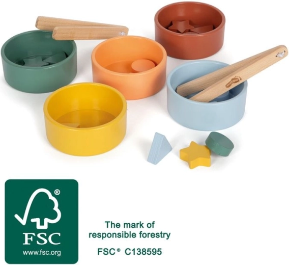 Táto vzdelávacia sada spája prirodzenú zvedavosť detí s princípmi Montessori. Drevené misky a tvary v sýtych farbách pozývajú k voľnej hre, triedeniu a prenášaniu pomocou drevených klieští. Deti si rozvíjajú úchop, presnosť a sústredenie a zároveň sa učia rozpoznávaniu tvarov a farieb.