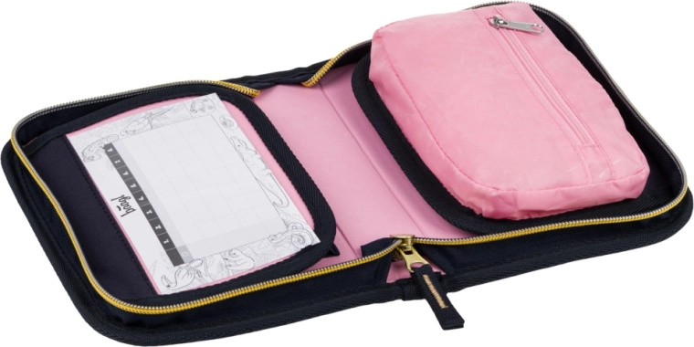 Vnútro ponúka vrecko na drobnosti, okienko na rozvrh hodín a pevné gumičky vhodné aj pre trojhranné pastelky a fixky.