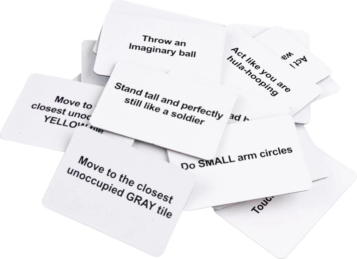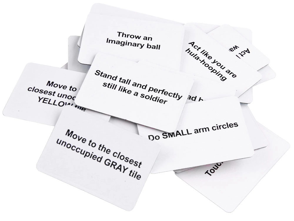 27 prehľadných kariet v angličtine s krátkymi inštrukciami pridáva akciu: skáč, balansuj, presuň sa na najbližšiu farbu a viac.