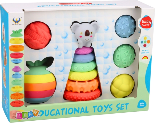 Súčasťou je farebná pyramída s figúrkou zvieratka na vrchole, niekoľko senzorických loptičiek s výstupkami a skladacie jabĺčko z prstencov. Výrazné farby pomáhajú rozvíjať vizuálnu percepciu a uľahčujú rozpoznávanie farieb. Ideálne na samostatnú zábavu aj spoločné chvíle s rodičmi a ako skvelý darček pre bábätká a batoľatá.