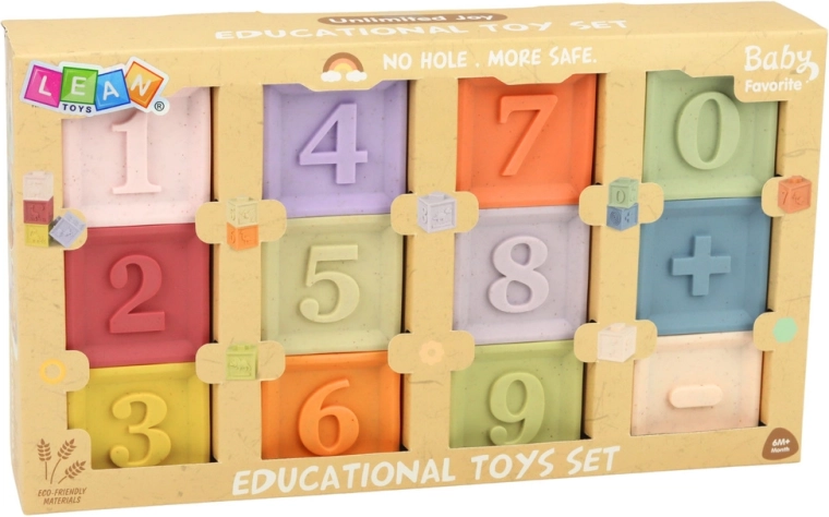 Každá kocka nesie reliéfne číslice 0–9 a základné matematické symboly, ktoré deťom pomáhajú pochopiť počítanie a jednoduché operácie prirodzenou, hravou formou.