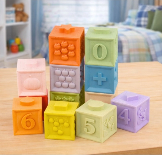 Mäkká elastická guma umožňuje kocky stláčať, bezpečne stavať a pohodlne držať. Rozmer 5 × 5 cm je ideálny pre malé detské ruky.