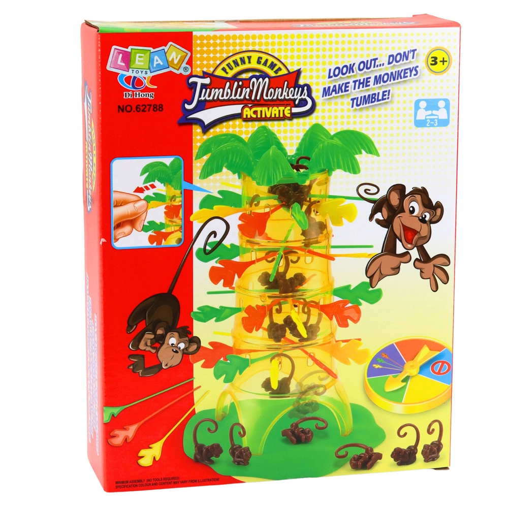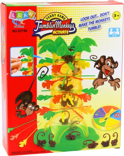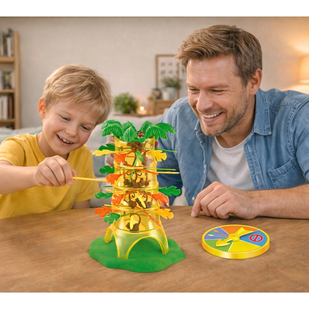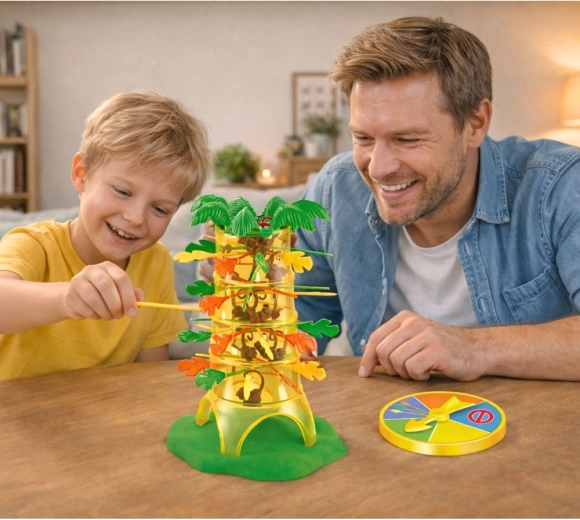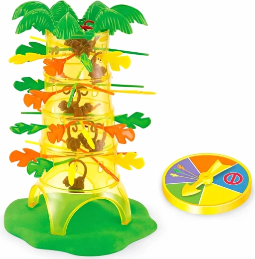 Roztočte napätie od prvého ťahu! Na začiatku umiestnite opičky do stromu a podoprite ich farebnými tyčinkami. Koleso šťastia určí farbu tyčinky, ktorú musíte opatrne vytiahnuť. Každý chybný pohyb môže spôsobiť, že opičky spadnú – a putujú k vám.