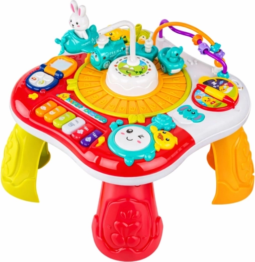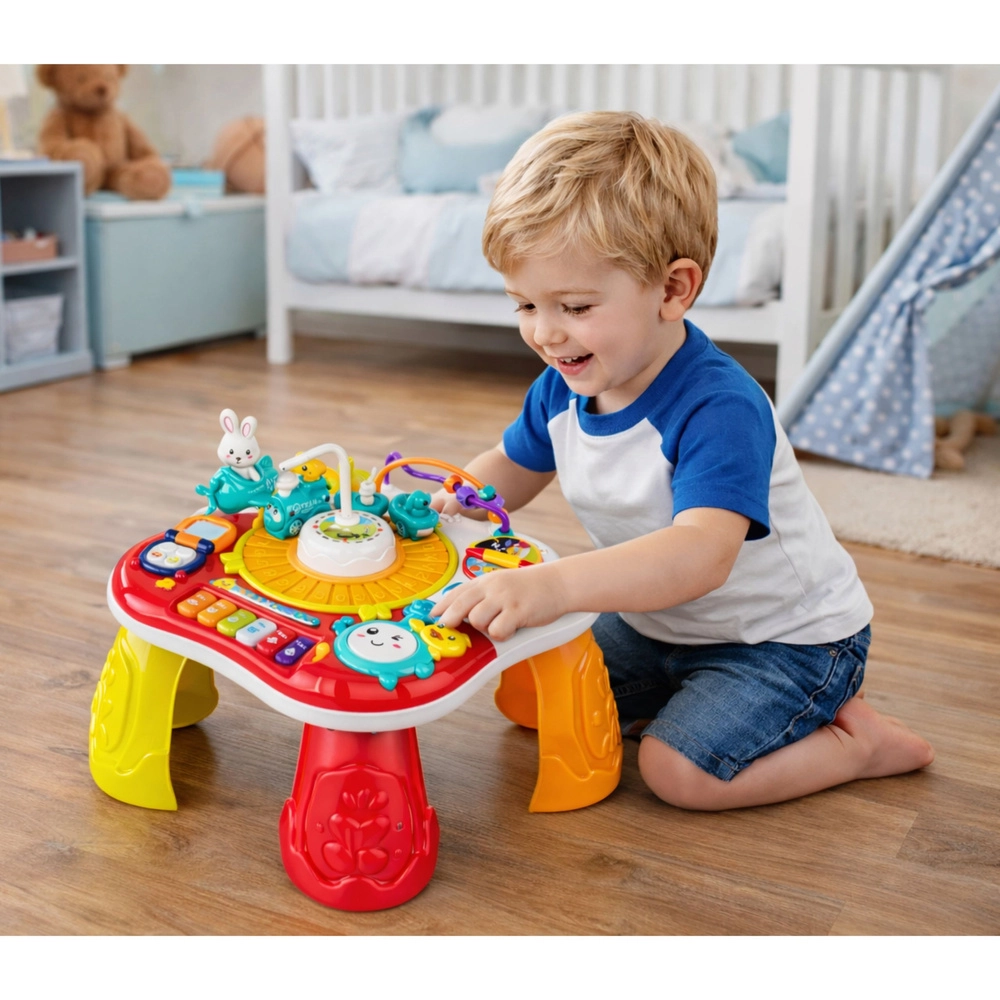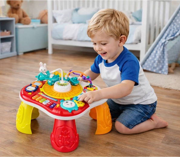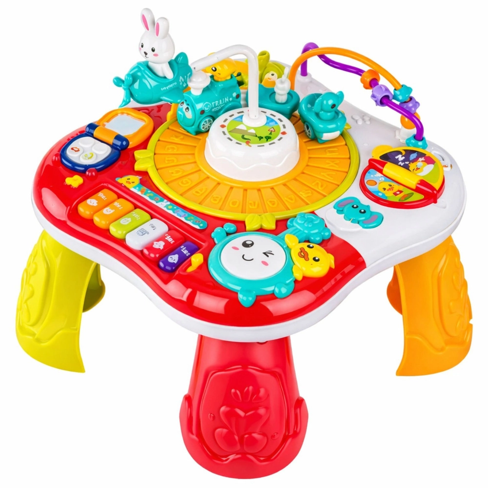 Interaktívny vzdelávací stolík 2v1 je skvelá voľba na rozvoj zmyslov a zručností detí. Ponúka pianínko s melódiami, svetelné a zvukové efekty, imitáciu telefónu, otočné kolieska a ozubené kolá aj pohyblivého zajačika, ktorý púta pozornosť. Vďaka odnímateľným nohám ho ľahko premeníte na plochý vzdelávací panel – ideálny pre rôzne vekové fázy.