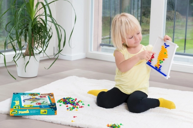 Mozaika LENA so 100 farebnými klobúčikmi je ideálnou voľbou na kreatívne hranie doma aj v škôlke. Vďaka jednoduchému systému vkladania kolíčkov do perforovanej dosky si deti precvičia koordinačné schopnosti a trpezlivosť, zatiaľ čo vytvárajú vlastné motívy – zvieratká, vozidlá či fantastické obrazce.