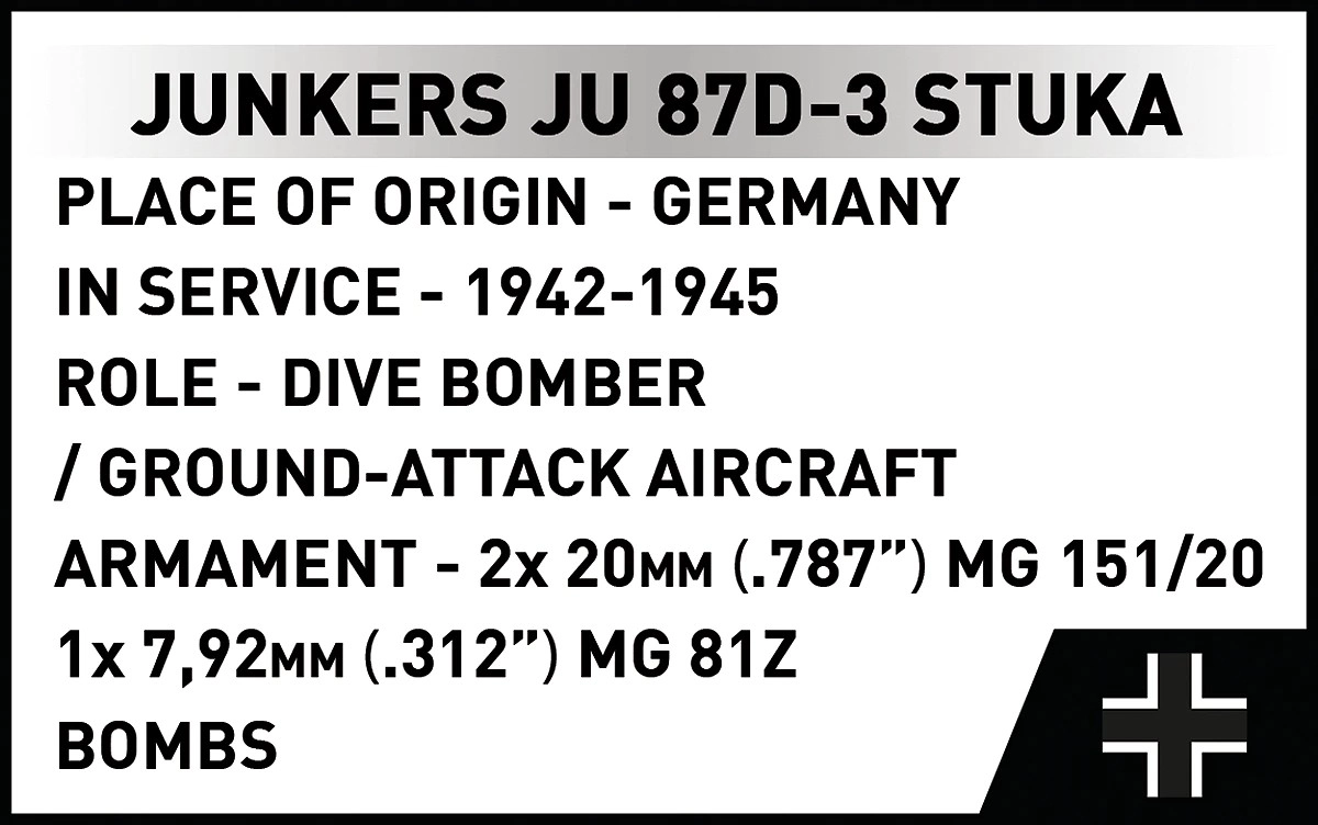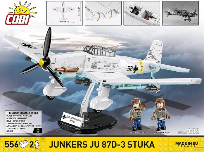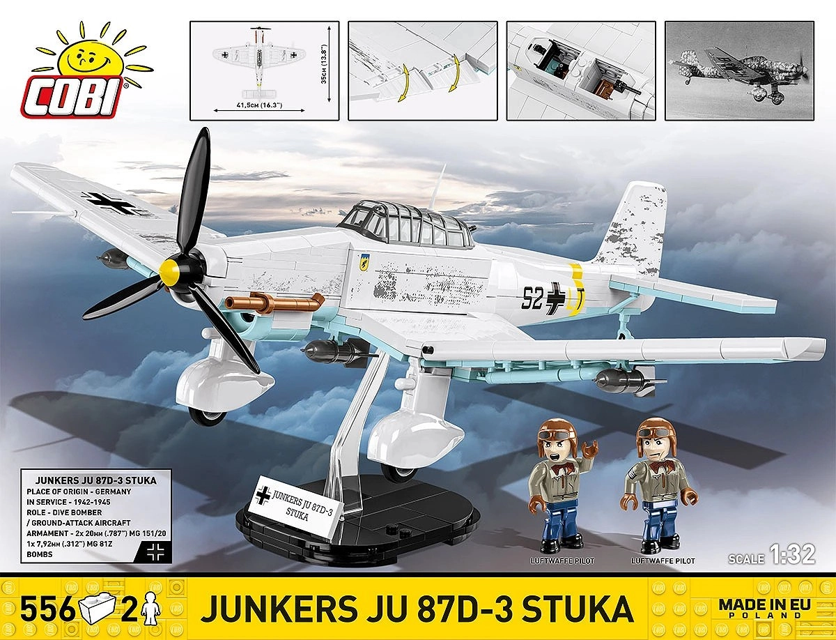 Súčasťou sú 2 minifigúrky posádky a čierny stojan s názvom „Junkers Ju 87D-3 Stuka“ pre atraktívne vystavenie modelu v lete.