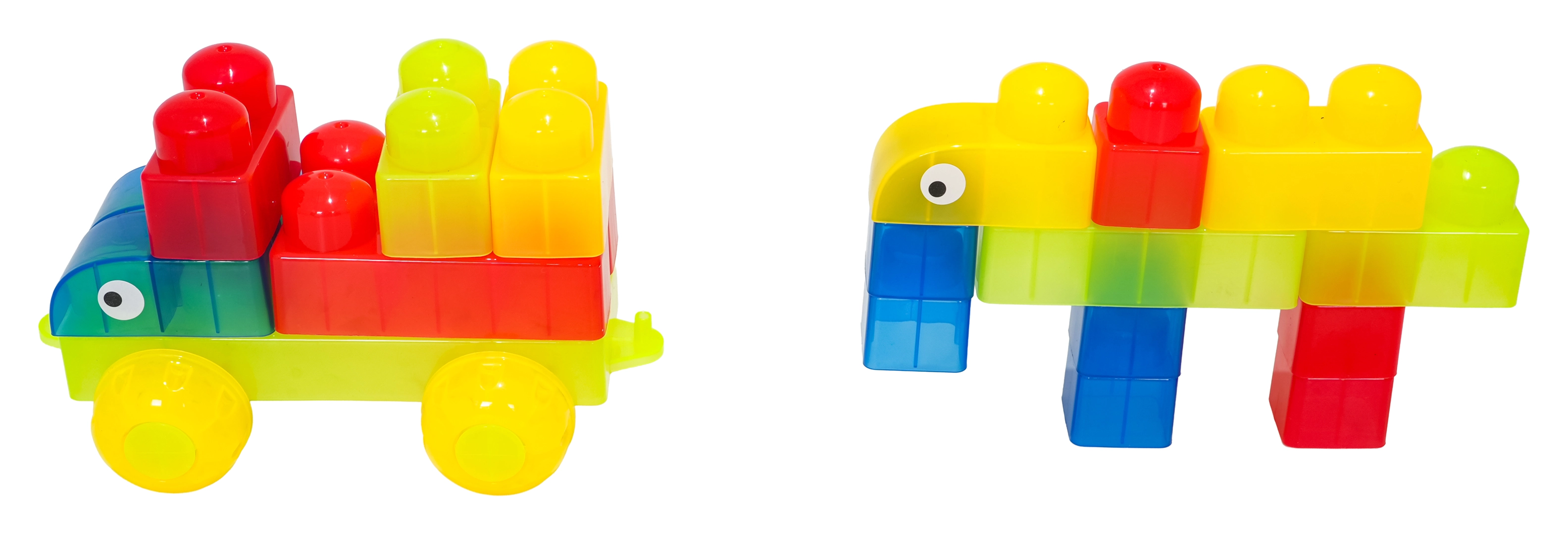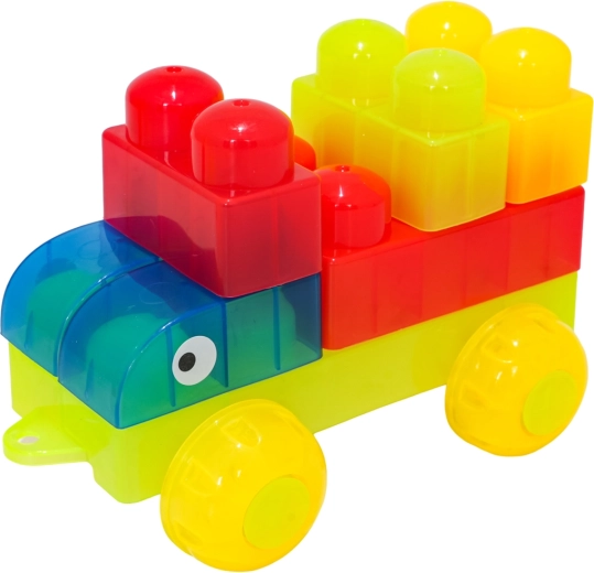 Podvozok s kolesami a diely so strieškou umožnia rýchlo vytvoriť autíčko, zvieratko alebo postavičku – zábava aj učenie v jednom.