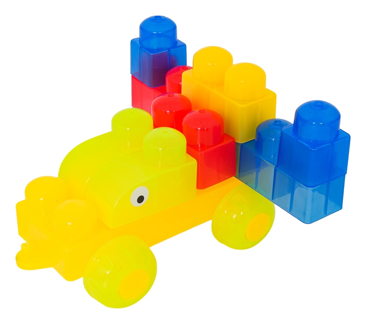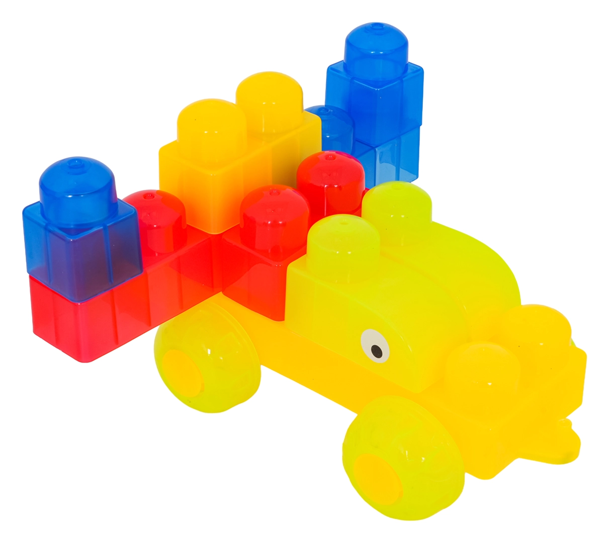 - 4× trojitá kocka, 8× dvojitá kocka, 16× jednoduchá kocka, 1× podvozok, 4× koleso, 4× kocka so strieškou, 6× samolepka s očkami, obrázkový návod