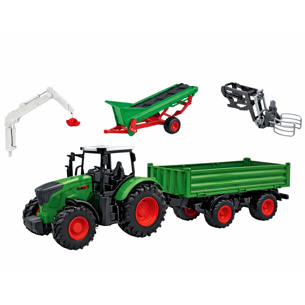 Súčasťou je traktor s ťažným závesom, príves, dopravník, ohrady s bránami, figúrky farmárov a zvierat i rad náradia a príslušenstva. Hra rozvíja jemnú motoriku, predstavivosť a role‑play zručnosti.